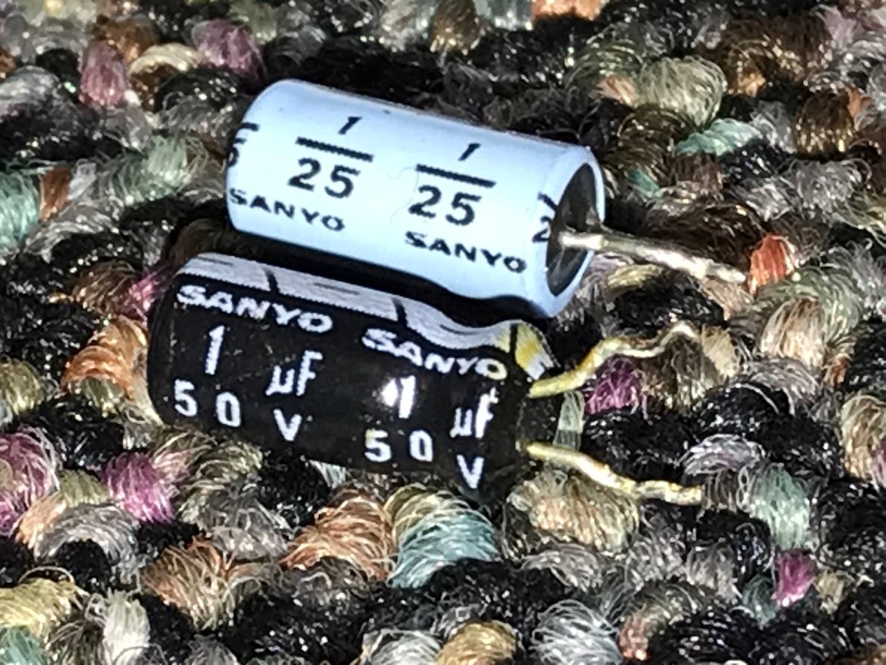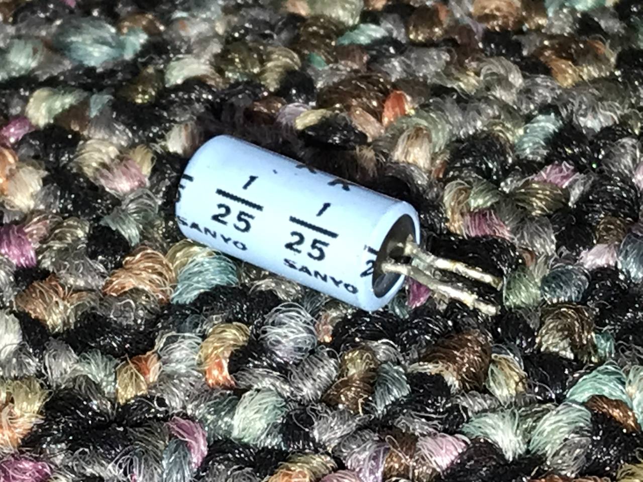 I've been working on a 1984 Sanyo 27" color TV which had a smattering of bad caps in the video switching circuit. I found this oddball little 1uF 25V cap which looks to me like an early polymer, but I can't find concrete info proving it. I know Sanyo was a big player in early polymer cap development and this is the time period where they were just getting on the market, so I'm wondering if anyone has crusty old datasheets that could help identify it and determine if my suspicions are right? It has the same epoxy end seal and font/formatting as some old stock Os-Cons I've got laying around, and compared to one of the conventional looking electrolytics I also changed out, the ESR tests much better (2.4 ohms vs. nearly 5 for the black lytic).