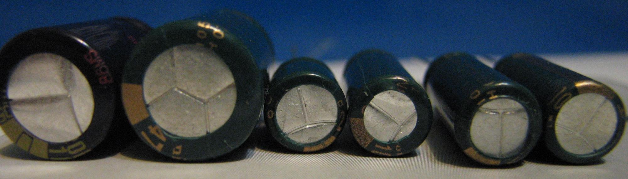 Notice the Panasonic T vents are being used on these obviously fake green Nichicon HD, HN, and HM. These guys are learning. Gone are the days when all you had to do was look at the bunge. The bunge on the last capacitor on the left, a Panasonic FC 10V 2200uF, looks impeccable but this is NOT a real Panasonic FC, it is also a fake. A very good fake. It is rubber and not synthetic like a real FC. It's also flimsy, if I put a little pressure on it, it recedes into the can. Sorry about the image quality on the bunge shot.
