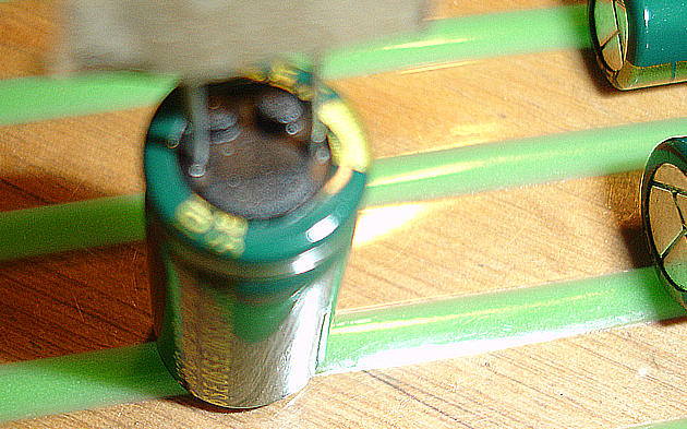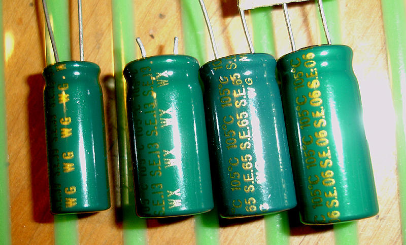 The 16v 2200uf are a bit of a muddier green than the others. Their is a "wave" in the series lettering. ESR is .02 but the capcitance is 1550(!) and there are variances among