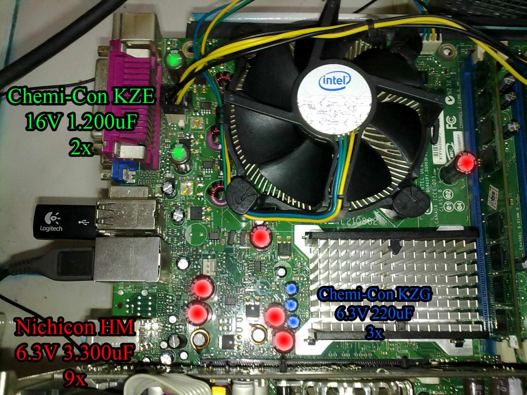 Hi, i'm having problem with Intel DG965RY mainboard. It's always power on by itself for 2 seconds and then turn off every time i plug in the AC cord. It also had a buldging 6.3V 220uF KZG cap next to the north bridge which i have replaced with 10V 470uF nichicon from a donor board (there's three of them).
