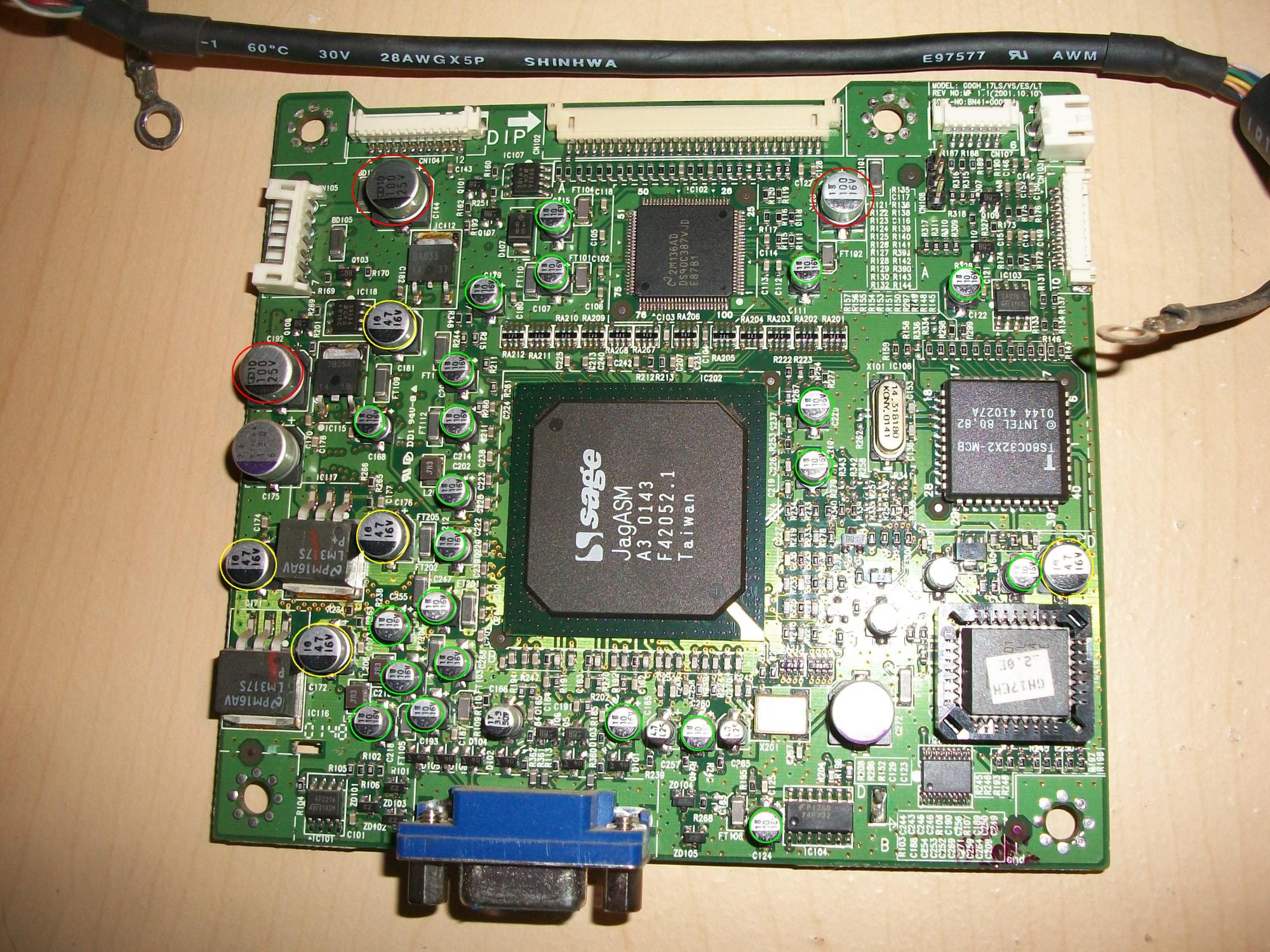 The 25V 100uF look like they have the UCC Logo with a dot in the middle. Some of the other ones look like they have the Fujitsu logo, but I can't be sure...