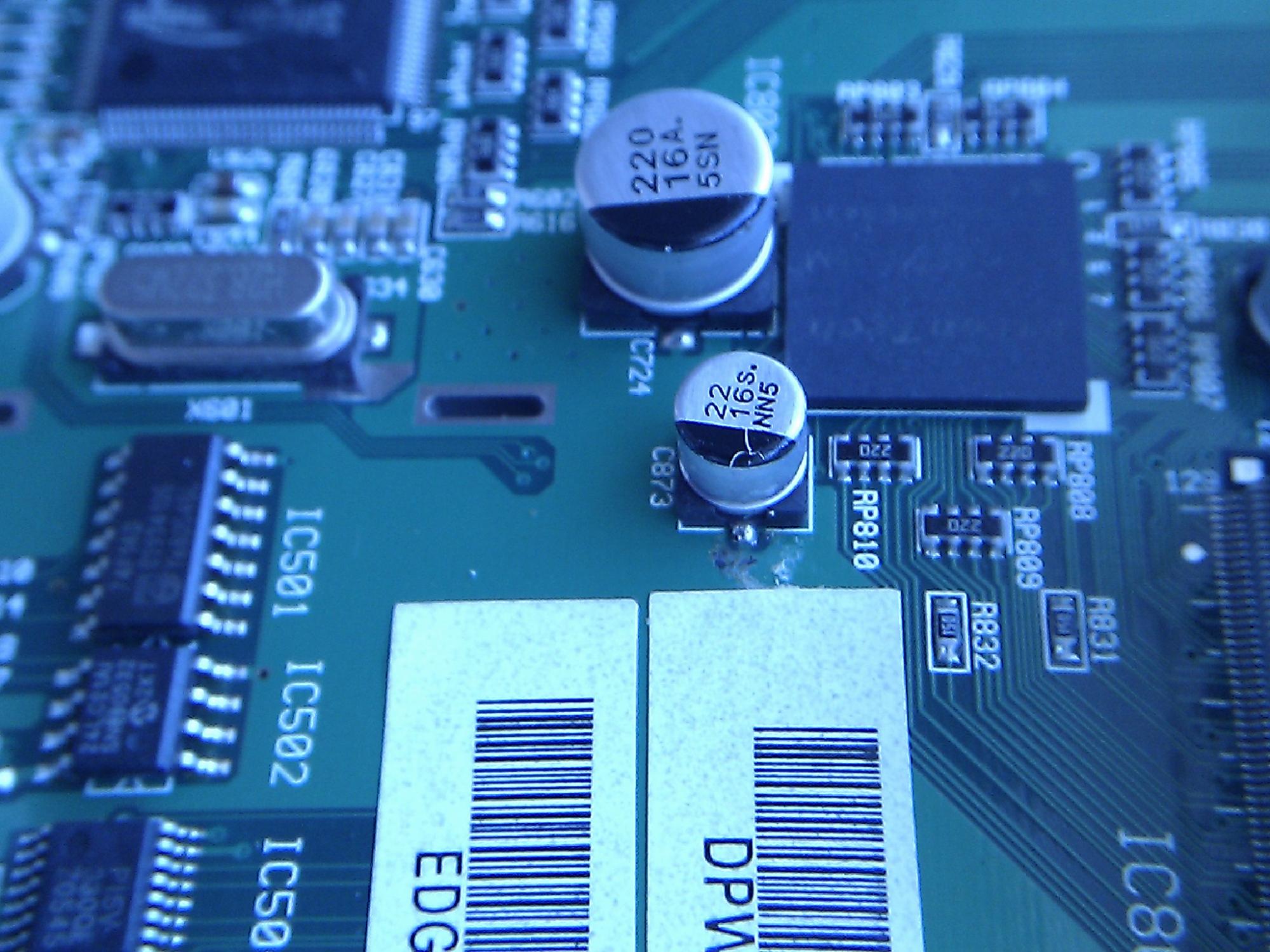 First off please excuse my noobishness, and spare me the spankings. I have a Maxent 50x3 I am attempting to repair without destroying. It has some crazy vertical lines in front of the image that come and go but seem to be worse as the board warms up. Pressing on the main board definitely affects the picture. As does spraying duster in the vicinity of this cap. Based on the appearance of this cap would you all suspect it as being bad or does this look like flux either from manufacturing or an attempted repair? Also the paint is cracked a little do you think this is from expansion? Thanks