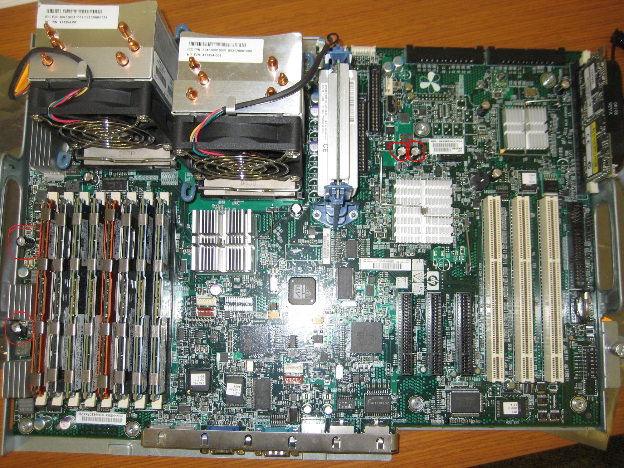 I have an ML350 G5 with two bad caps. One is ruptured, and the other is pushing out the bottom, I think, because the cap was tilted on the motherboard, and when I tried to straighten it, it felt like it kind of broke loose, like the electrolyte had stuck between the board and the cap (not the cap leads, just the electrolyte dried between the cap and the PCB).