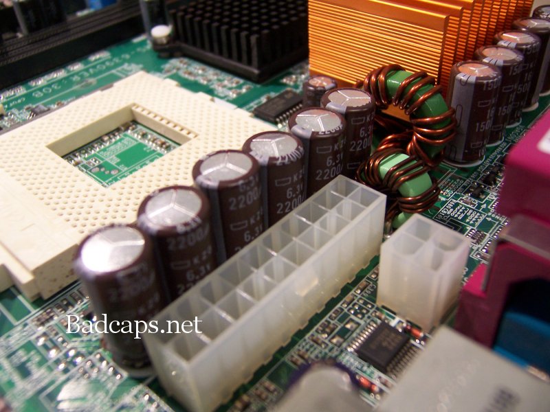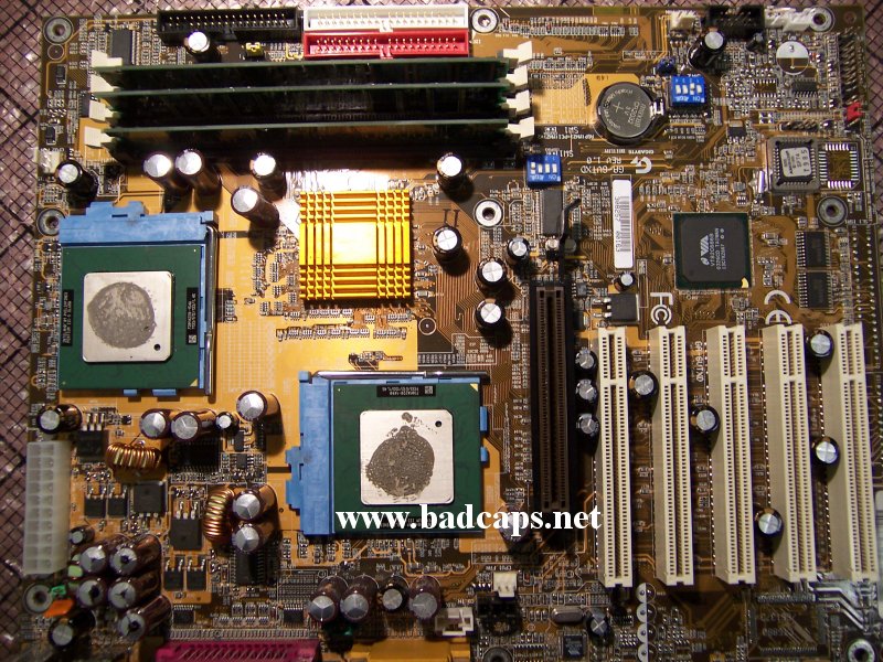 More KZG nightmares..... This is a Gigabyte dual Tualatin P3 board (forgot the model off the top of my head), running on a Zippy PSU (PSU is just fine). All the KZG's are popped.