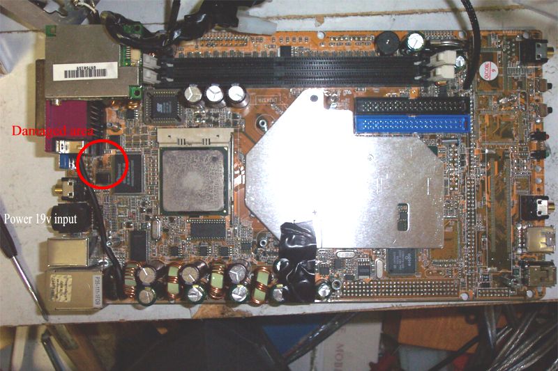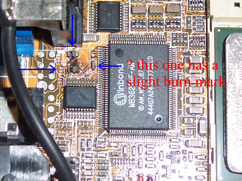 Alright, it seems like somehow the external 19v regulated powersupply had a voltage spike when it was powering down and spiked my great computer.. from what i can see there are two what appears to be capacitors, used to be tannish in color, probably a ceramic surface mount, burnt to hell... I measured one side of the capacitors and it does see the 19v when connected to the wallplug. so im guessing this is some sort of input power filter or something. nothing else appears to be burnt.. and nothing else seems to get any power anywhere else except where it ends at those two caps. Now im wondering, what can i do to replace these caps? i dont even think there is any markings on them, the only thing i can see is maybe size, there are a few somewhat larger ceramic caps on the board, but it seems that these two are probably related to the ones that are a little smaller (maybe 1/8 times smallr) than the larger ones. is it possible to throw any sized surface mount cap on here? and do you guys think that anything else may be blown?