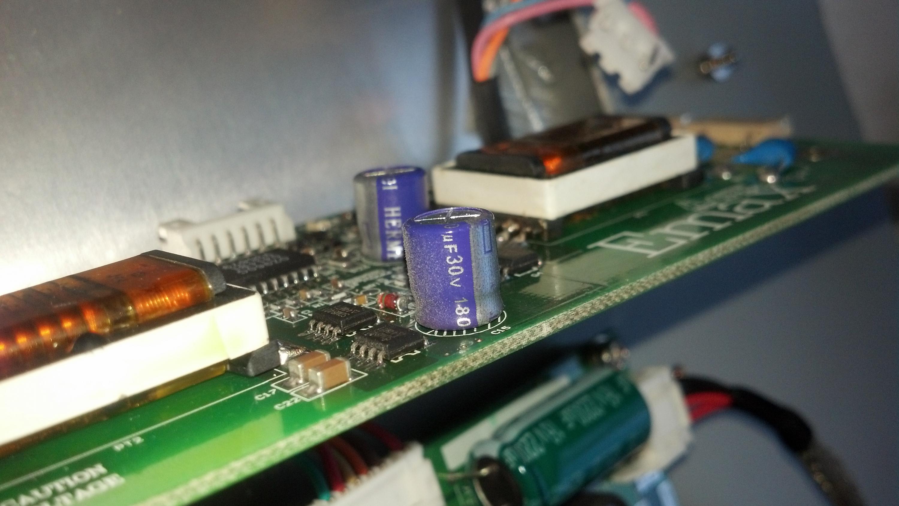 I have a Viewsonic VP191B here that was making a weird whining sound when in standby, so I figured bad caps. It was manufactured on 7/24/04. I open it up and find all good Japanese caps on the power board, Taicon on the main board, and HERMEI LZ series on the inverter board. I tested these two Hermei caps 180uF 30V caps (Isn't that a strange value?) and they read 178.6uF 0.07Ω ESR, and 179.7uF 0.07Ω ESR. Look how hot that board got, and it's almost a decade old...How the hell did they last so long and stay perfectly in spec?!