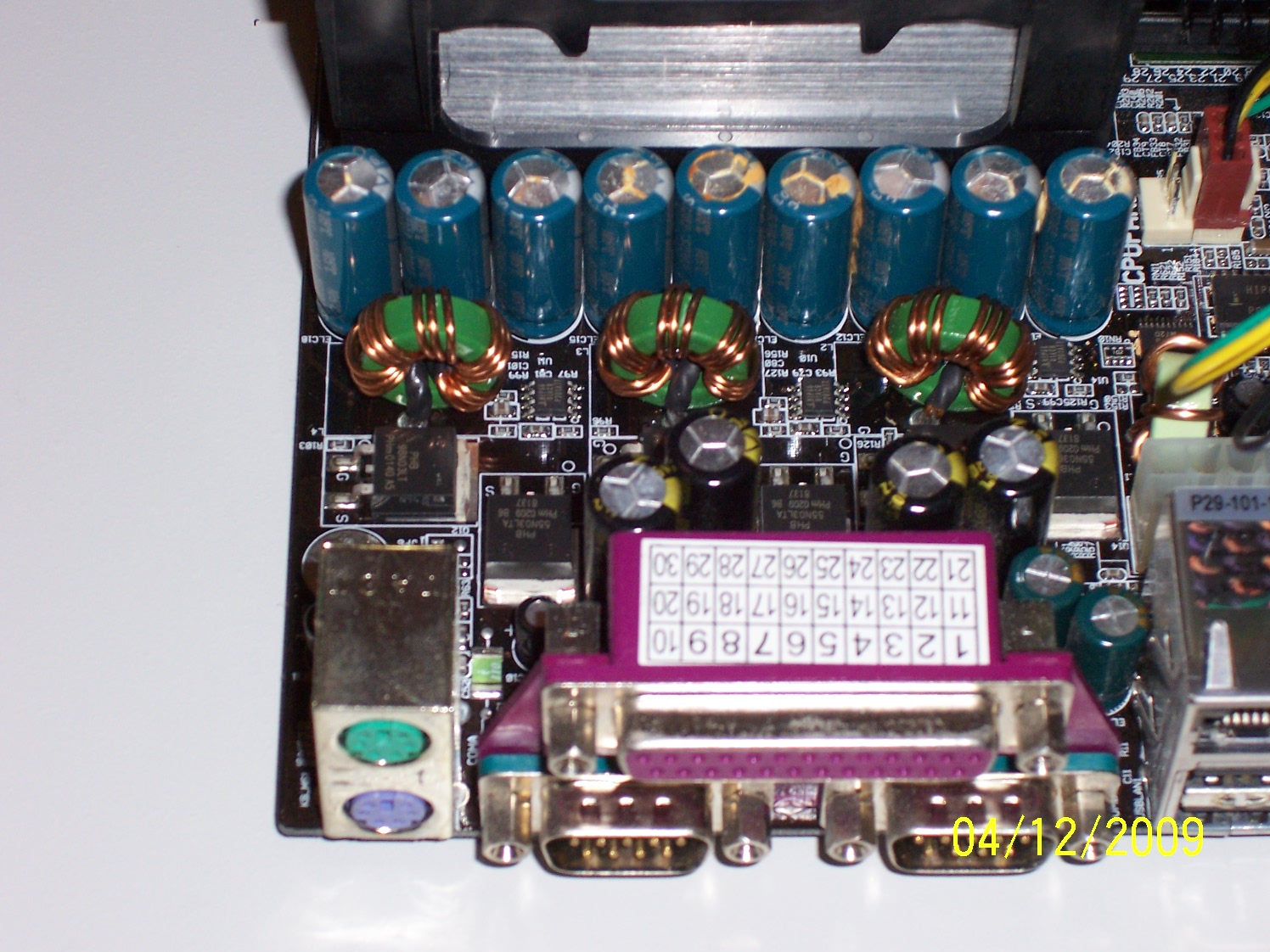 I have a Soyo SY-P4S-645DX Dragon Ultra. As you can see from the attached photo, I had a bank of nine Sacon 2200 uF 6.3 volt caps bulging and leaking at the top. Since this computer is used as a dedicated flight simulator (FS2004), I recapped with Nichicon PWM series. I'm sure FAA would not approve of flying with leaky capacitors!