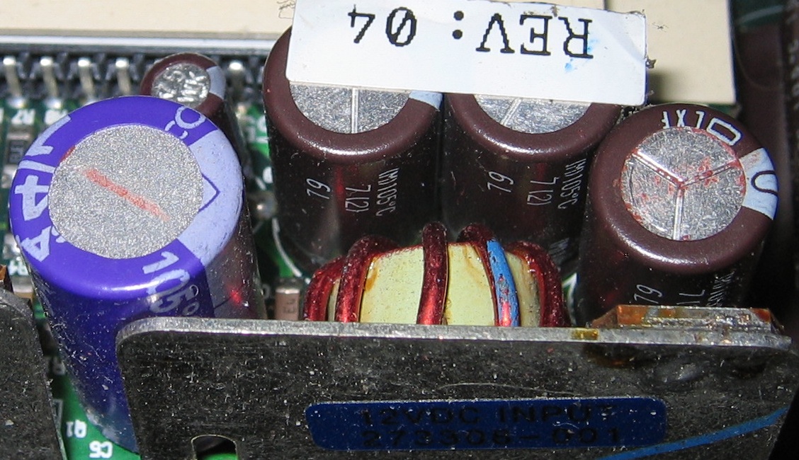 While looking at the parts I salvaged from my old Proliant server, I came across this cap on the VRM board for one of the CPUs. The top is still perfectly flat with no signs of bulging, and yet I can see brown stuff round the edge and in the Y-vent channels.