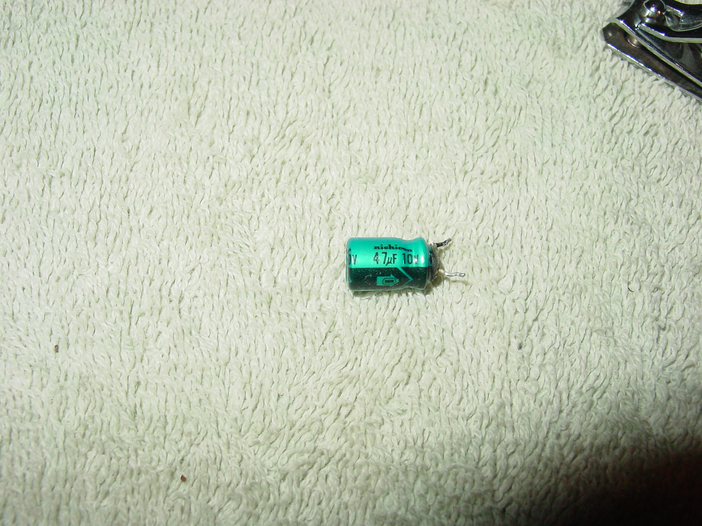 There are only 2 electrolytics and they are Nichicon, 1 is a 47uf 10v the other is a 3.3uf 63v. Both 8X12mm in size. Bungs on both protruding. No vent relief on top.