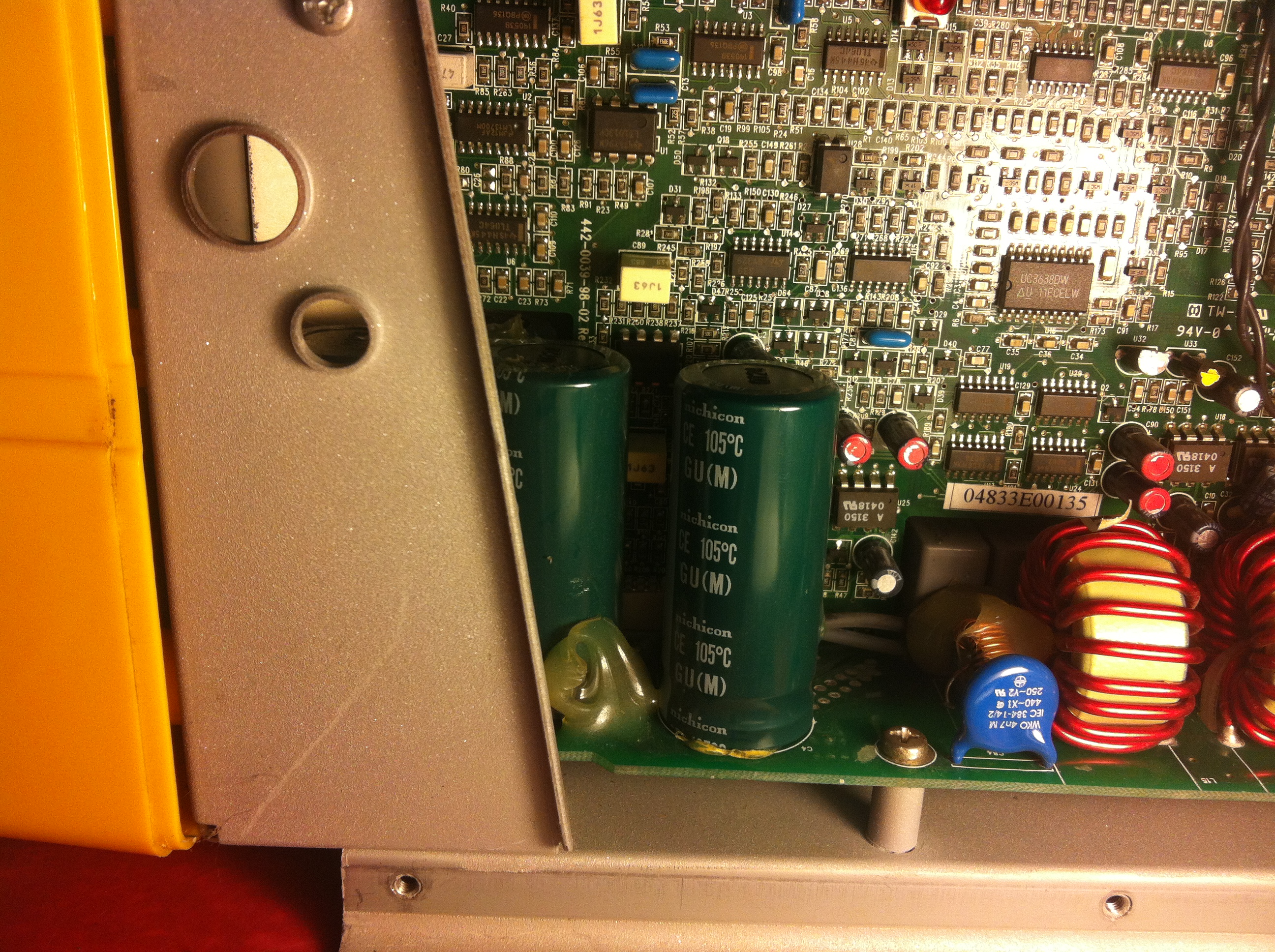 Those must be oooold, or they might be custom. The nichicon GU datasheet says they are white on black sleeve. I am not suspecting fakes at all, just, what is their capacitance and voltage rating?Look at these babies. Operated many years for a solar installation as a 120V pure sine inverter. Why it is open, is the switching relay finally failed through magnetism of the contacts, causing >single cycle transfer blinking lamps when switching off grid power.