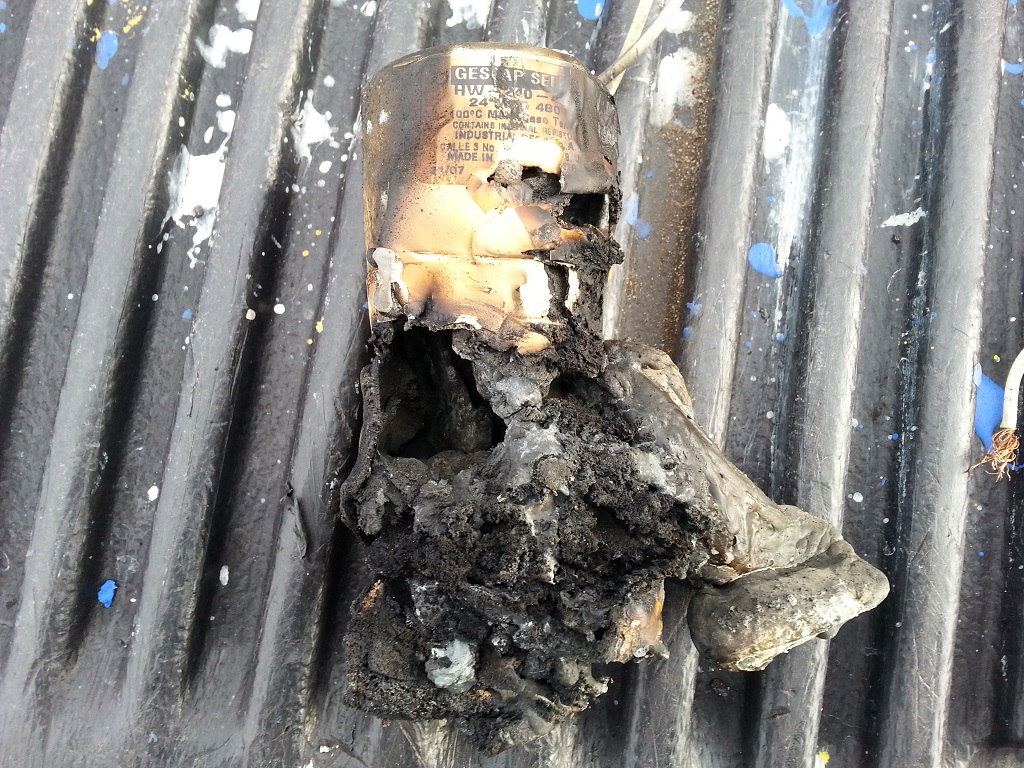 Here's one for the Hall of Shame: plastic-can 24uF, 480-Volt rated capacitor for 1000-watt metal halide light on a 45-foot high pole. Catastrophic failure, and it burned until it ran out of materials to burn. This is the reason why I don't replace them with another plastic-canned dry capacitor. I use only wet electrolytic caps in metal cans. When a metal one fails, it never burns, just goes open-circuit.