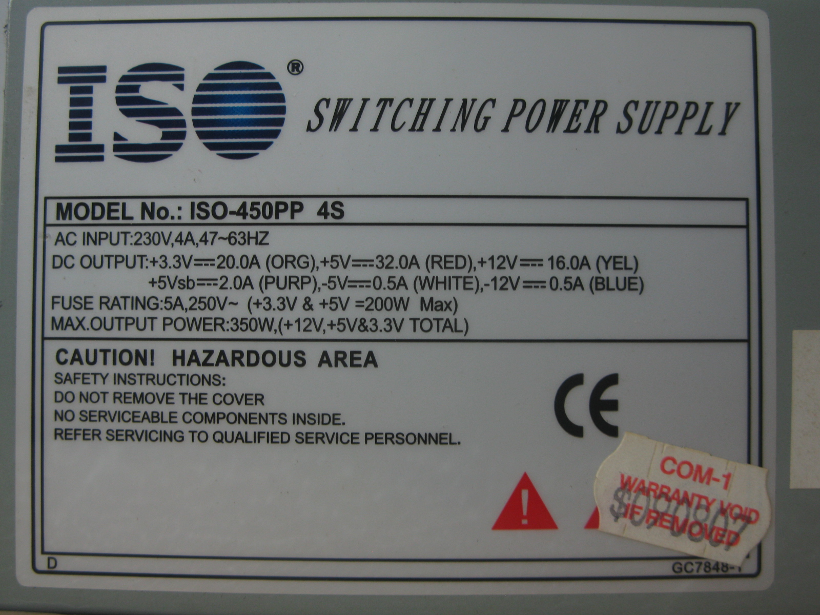 This ISO-450PP power supply suffered the Fuhjyyu plague, helped due to being absolutely caked in dust; this PC had never been cleaned since 2007! Even with only three caps bulging, I doubt the others are much better. Primary caps were 2x Koshin 680uF 200V however (whether they actually were 680uF or rebadged 470s or 560s is another story, I am yet to check them - they also look bulged underneath the plastic, and the lids don't seem to push down).