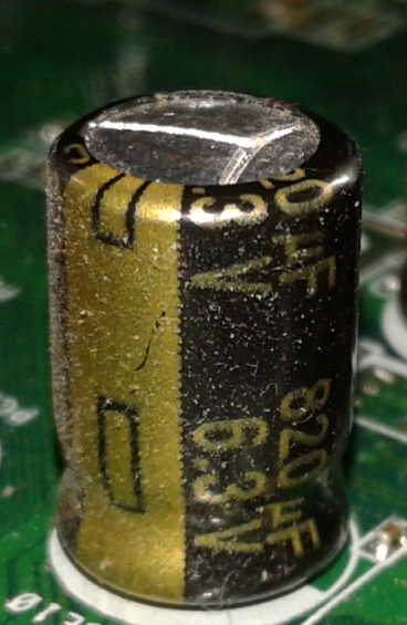 That capacitor is definitely starting to bulge. The board is just about eight years old judging by the date codes on the components. That negative polarity stripe (on the failed 820uF 6.3V Panasonic FJS) looks suspiciously fuzzy, but I don't think it's a counterfeit, because... it looks like it was polarized the wrong way around!