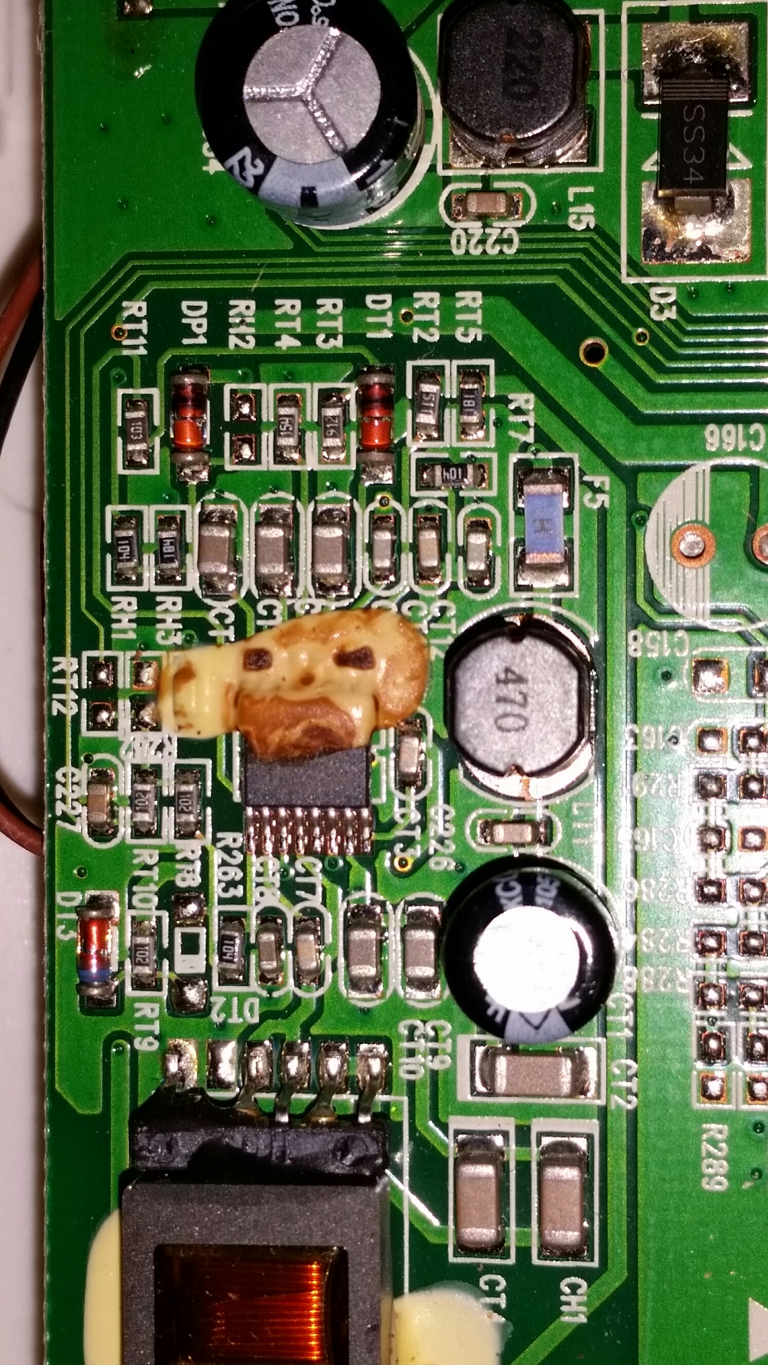 Looks like there is also that conductive glue on the high voltage transformer, lower left corner of the photo in the first post. Burn mark on right side of it, likely causing the display to shut down.