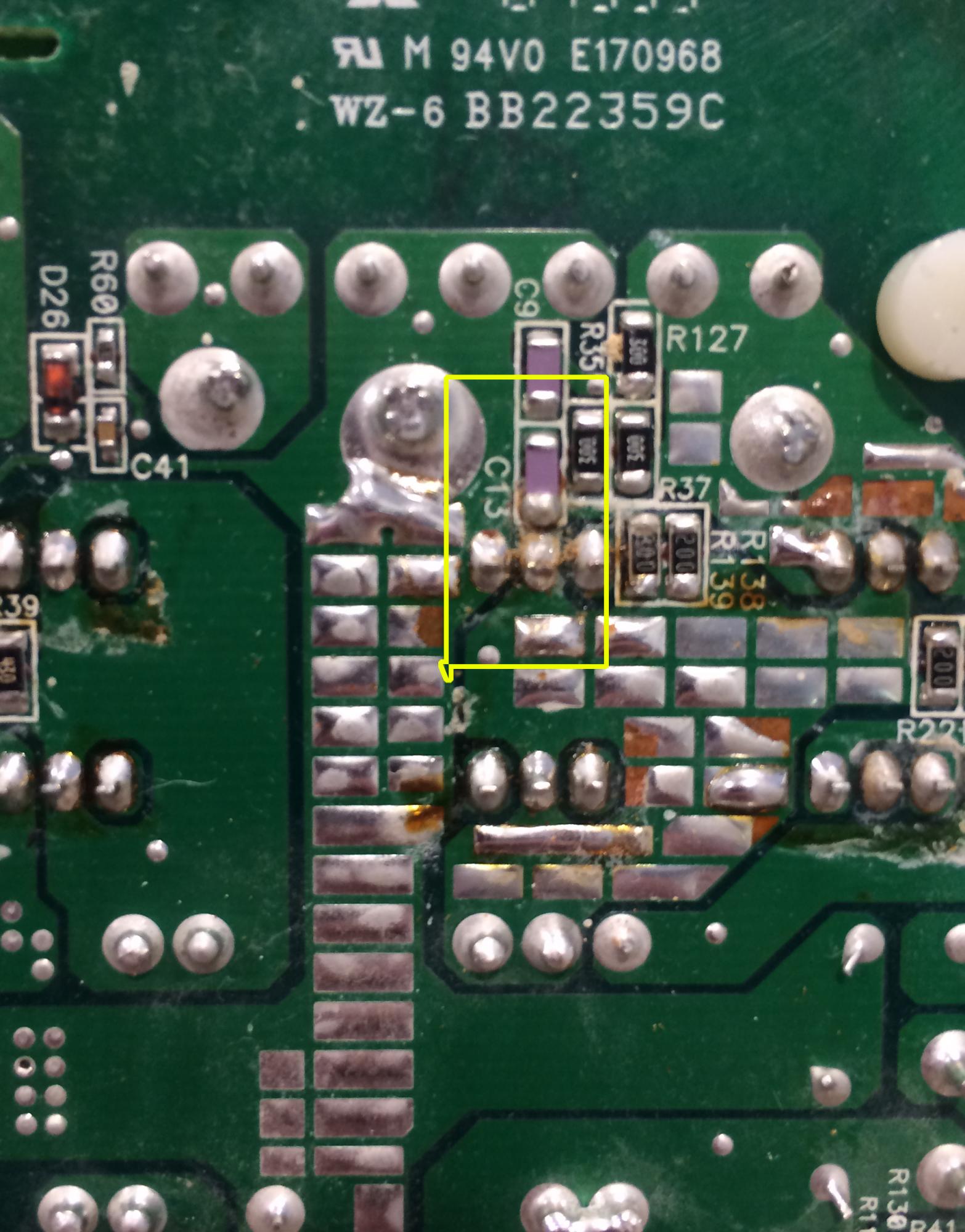 So I took it apart and one of the surface mount caps had this brownish residue around the edges of the solder joint. So I have a couple of questions: