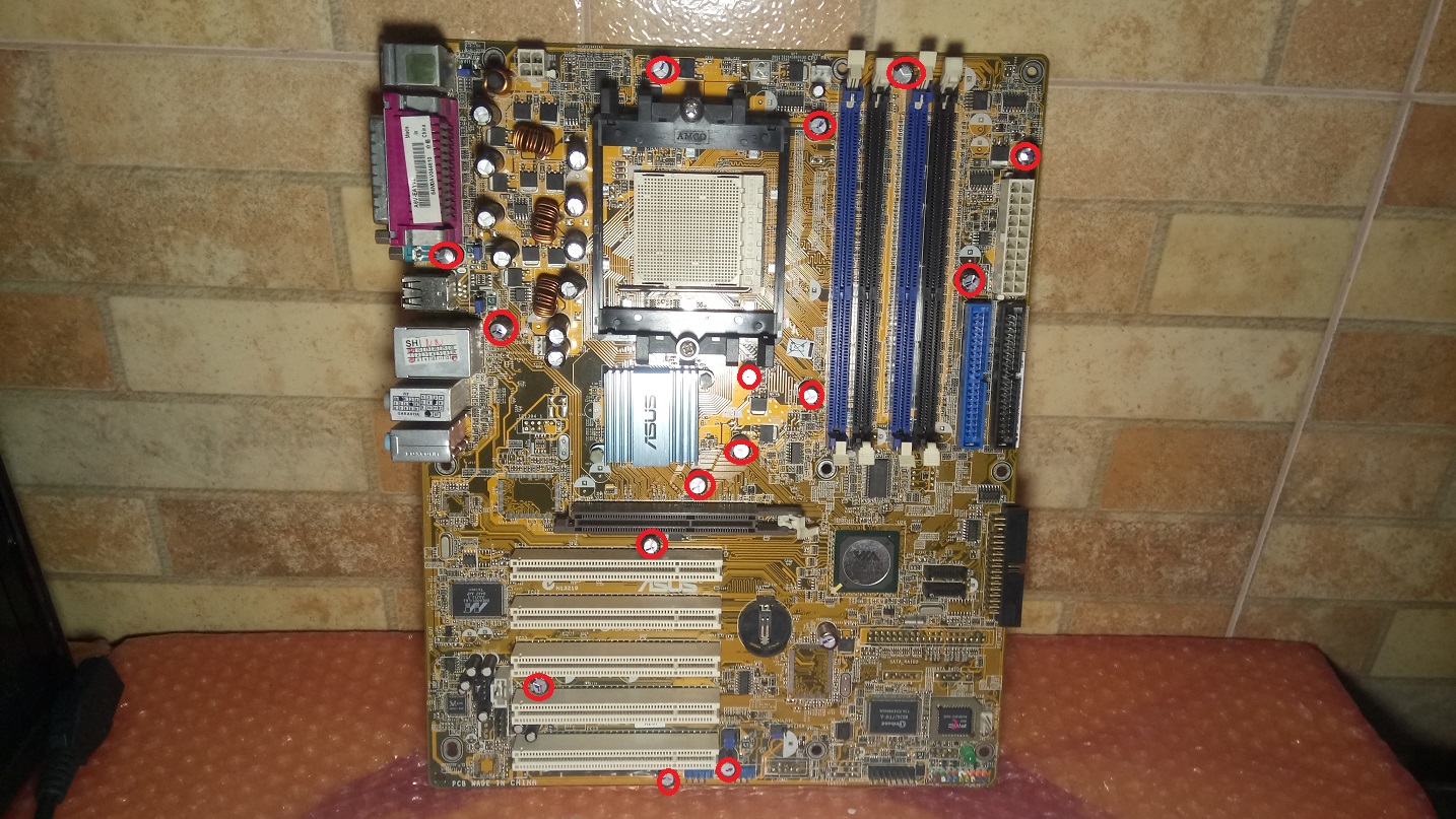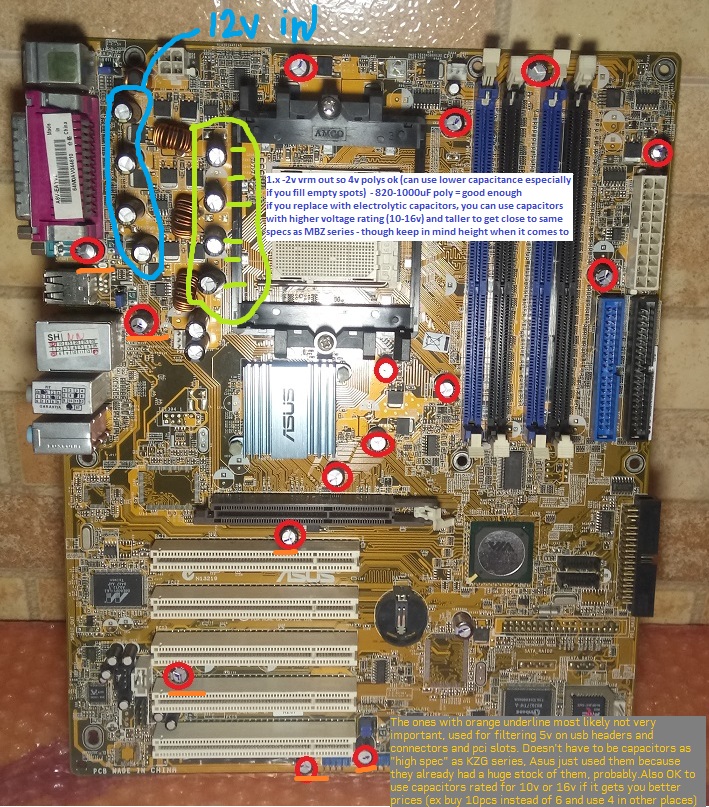 for the asus a8v, i think u missed a cap near the cmos battery right by the mosfet. i have this exact same board and the cap and mosfet there actually regulates the 5vsb supply for the board. i recommend replacing that as well so u have 16 kzg caps to replace not 15.