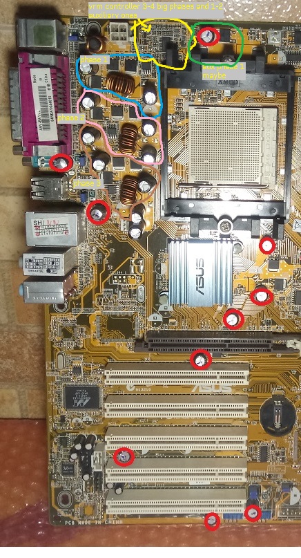 Got one more board for cap replacing - actually it just came back from a repair lab, asked how much just to have the caps changed would cost me and they told me the job would be ~US$250 (about twice I paid on the board) and I'd like to hear suggestions on which caps to choose since I'm going to buy them all and start swapping from the easiest boards first (this one have a lot of SMDs on the back pretty close to the caps terminals). I've circled the different caps in different colors for easier reading since the picture quality is pretty terrible.