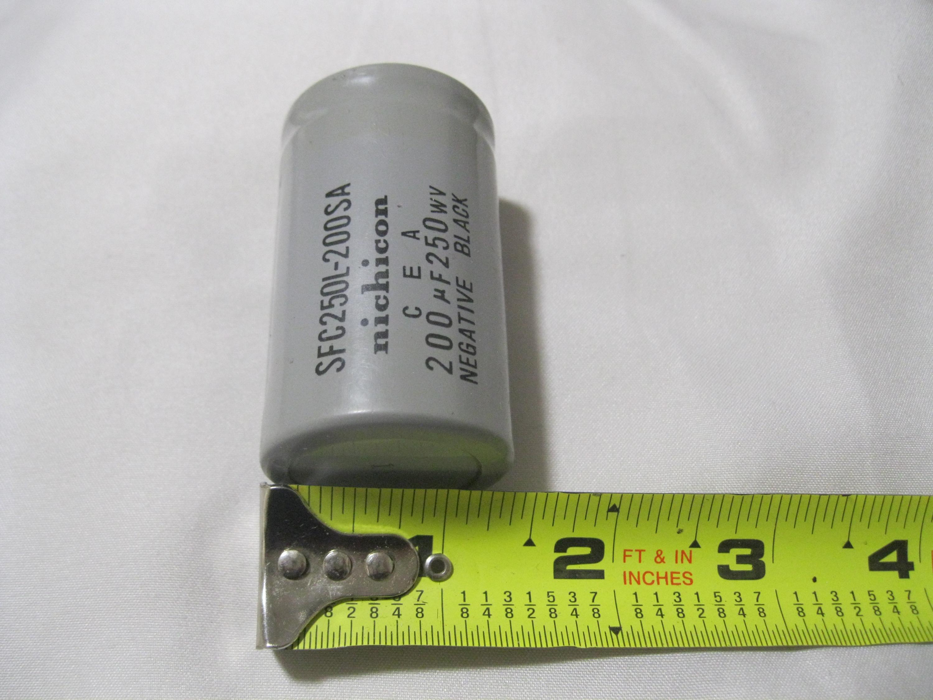 Hi All, I got a capacitor that i need to replace and can't seem to find it on digikey or mouser. It's a 200uf and 250wv it measures approximately 2.5 inches long by approximately 1 3/8 inches in diameter. If anyone knows where I can get one or one with equivalent values please let me know. Thank you all in advance