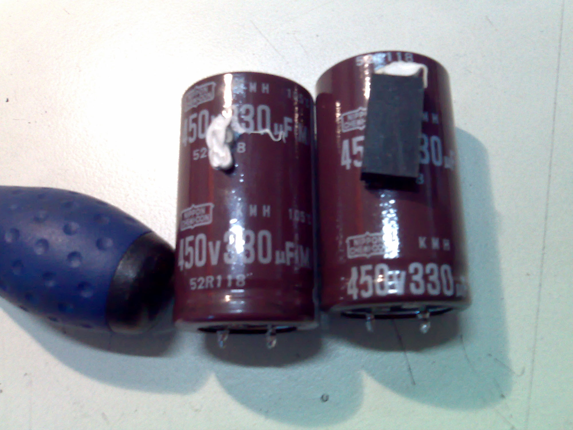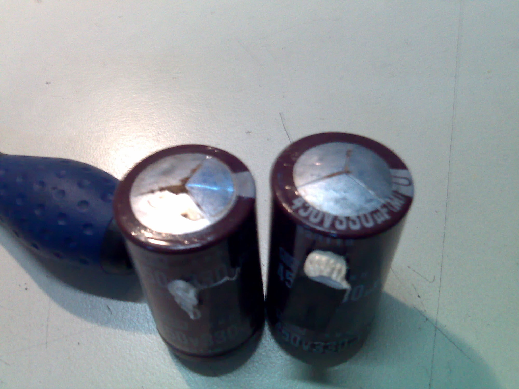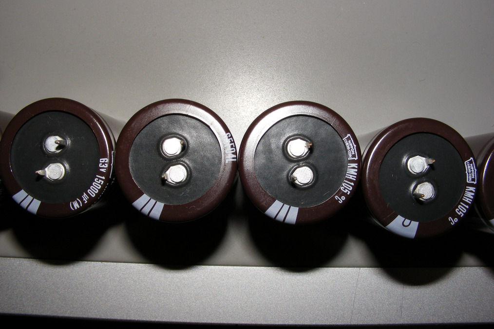 A couple of months later, while doing some re-wiring inside the amp, noticed that 6 of the caps (all the taller ones) have slightly bulged across the top... I thought I somehow abused them during some high power tests i've run earlier, and I hoped they will last for a while like that. But last week I opened the case and found out the 6 bad ones swelled even more (while the 2 smaller ones are still in perfect shape). I guess this rules out the possibility that I damaged the caps in the first place.
