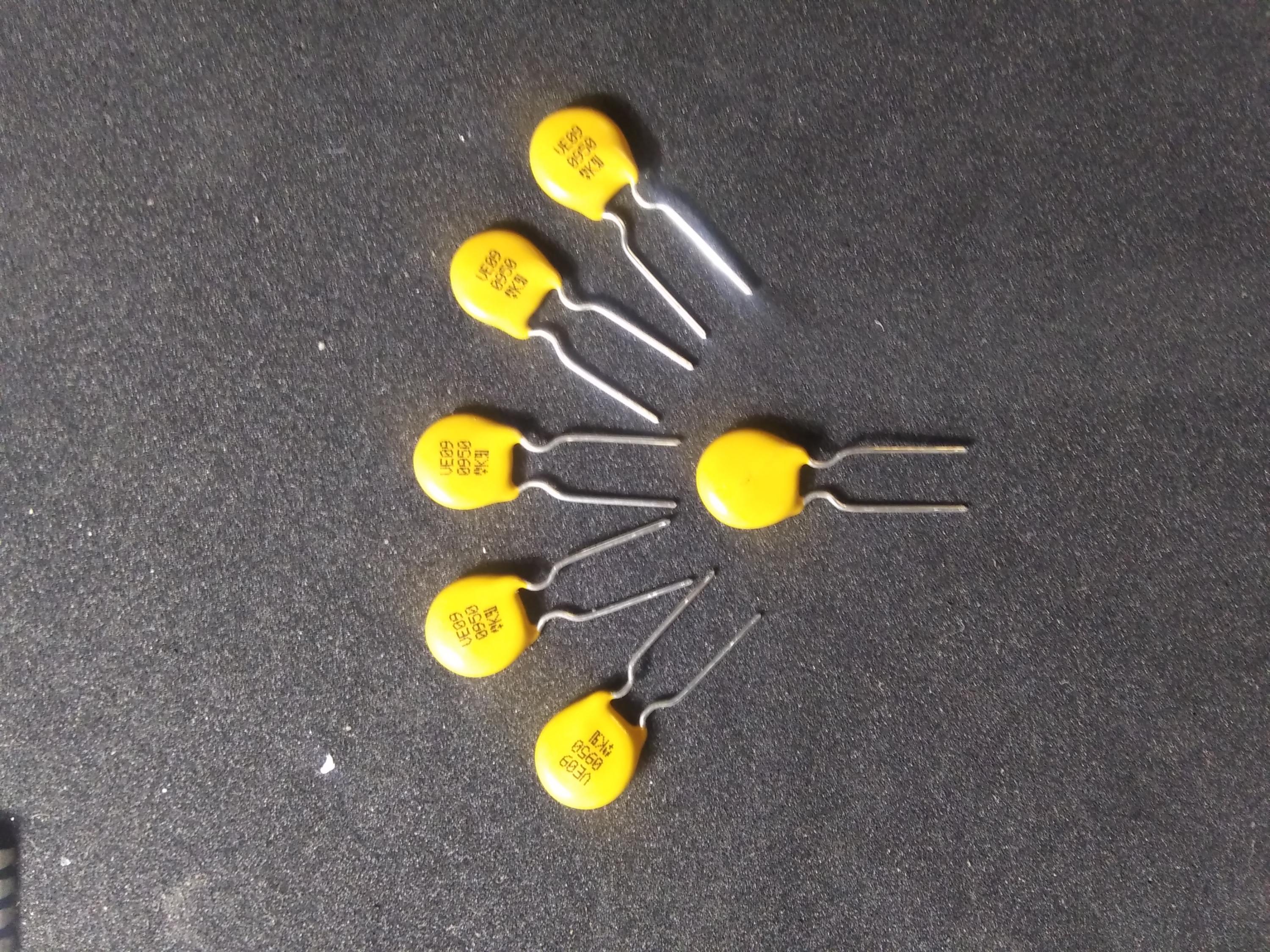 The yellow discs may be Metal Oxide Varistors (MOVs). The markings are unlike what would be typical for ceramic capacitors.