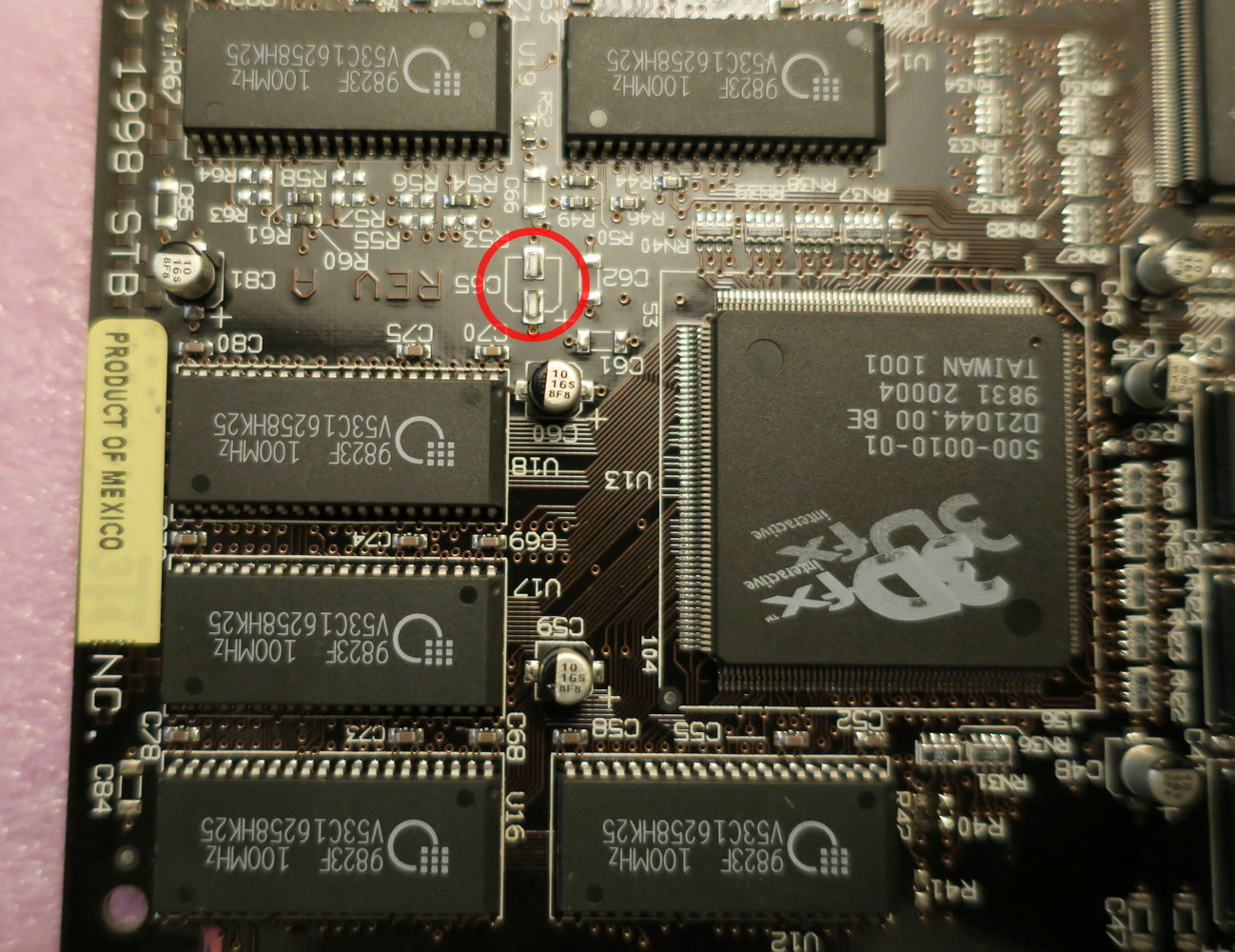 I have a 3dfx Voodoo2 graphics card that is missing a small cylindrical SMD capacitor (C65 in the attached photo, circled in red). I'm pretty sure it should be the same as all the other cylindrical capacitors on the card, which read these values on 3 rows: 10 / 16S / 8F8.