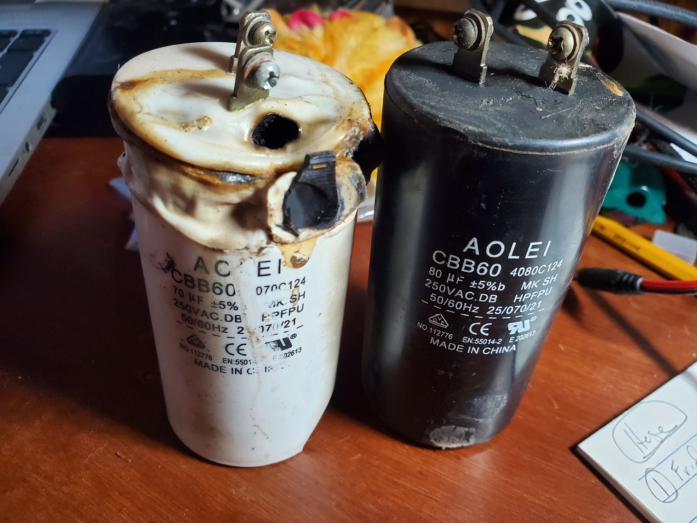Looks like the white one (70uF) may have been the Starting Capacitor one based on the issue experienced and the mess it is now? The Black (80uF) the running one? But I always thought Running Capacitors were always smaller Farad-wise?
