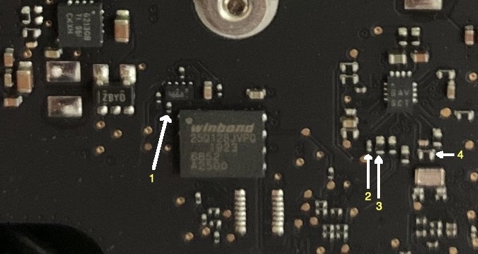 Respectfully request help identifying 4 missing components on a 2019 21.5" iMac board. Not worried about the Bios/EFI chip.
