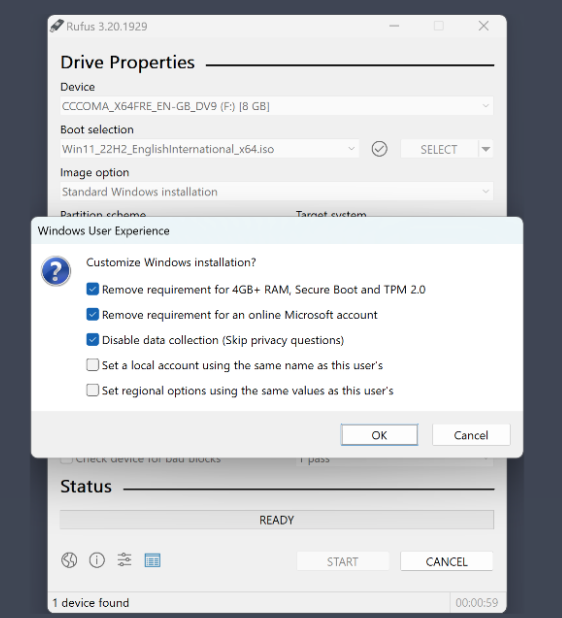 same way, make a install usb stick with rufus 3.21 and check boxes as in picture