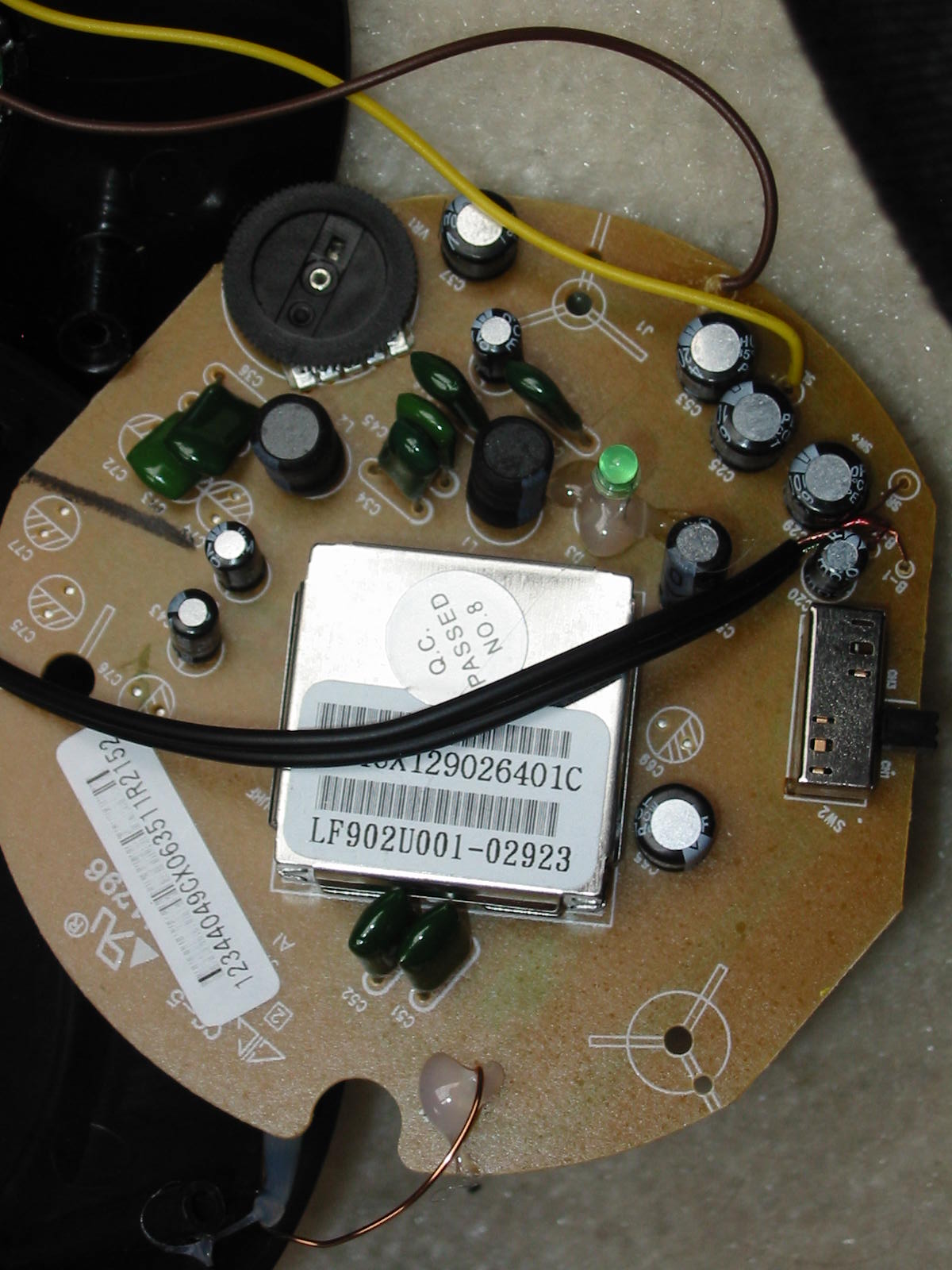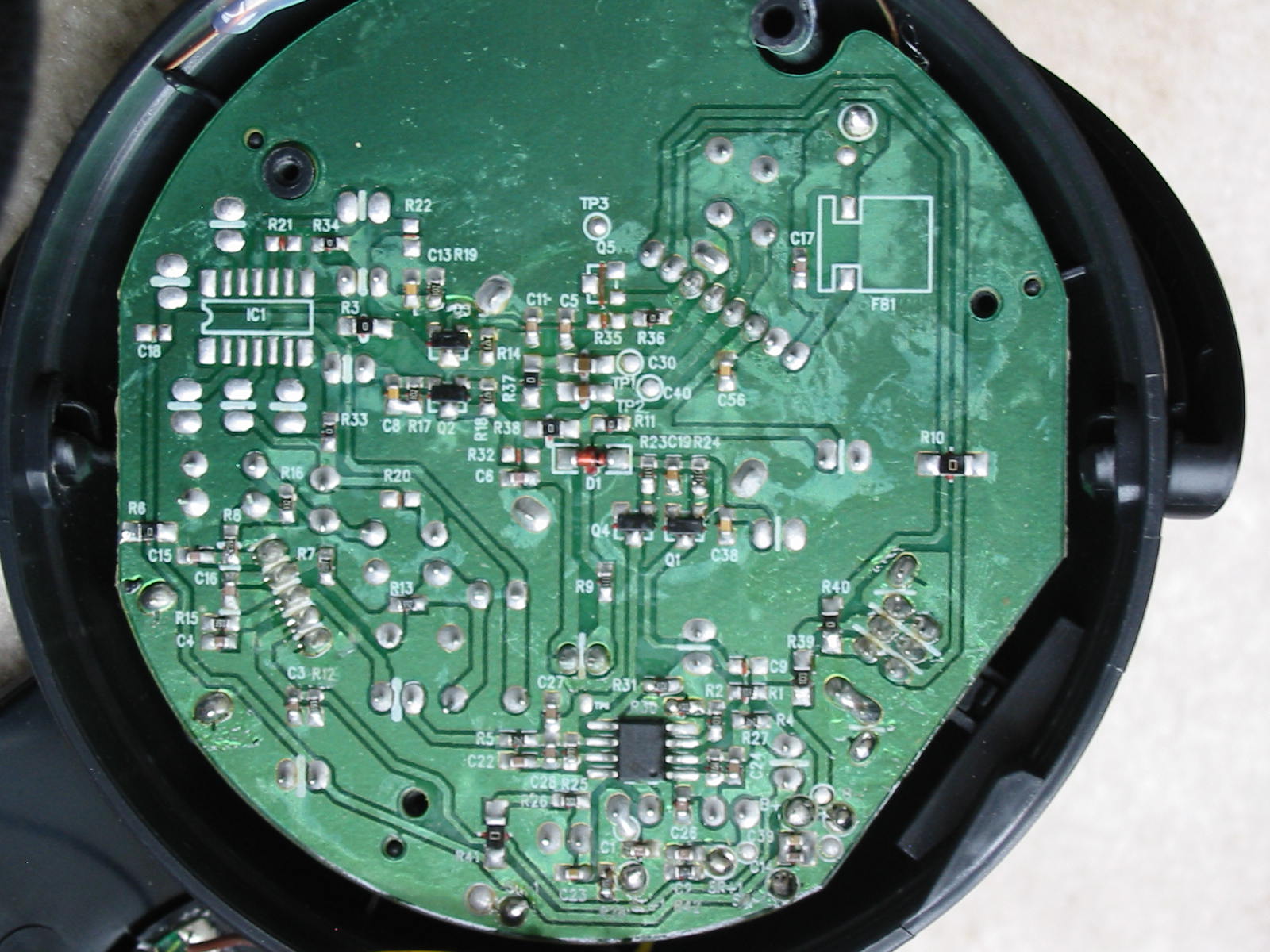 On the other side of the (now taken apart) ear cup is the PCB / electronics. Visible on the solder side is the amplifier IC (LS2308… i.e. TDA1308 -equivalent from what I found online).