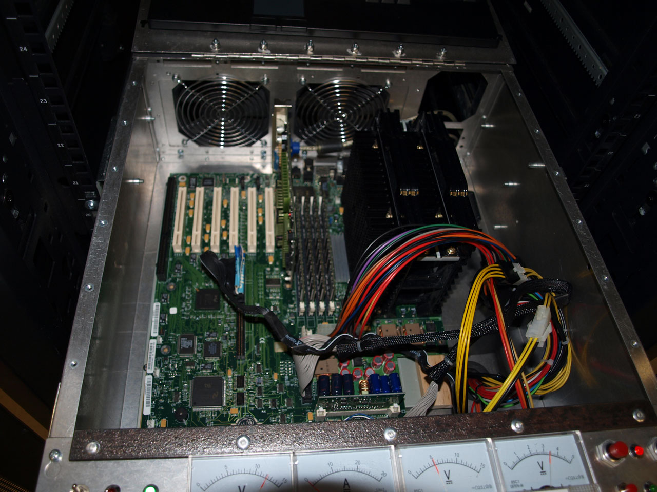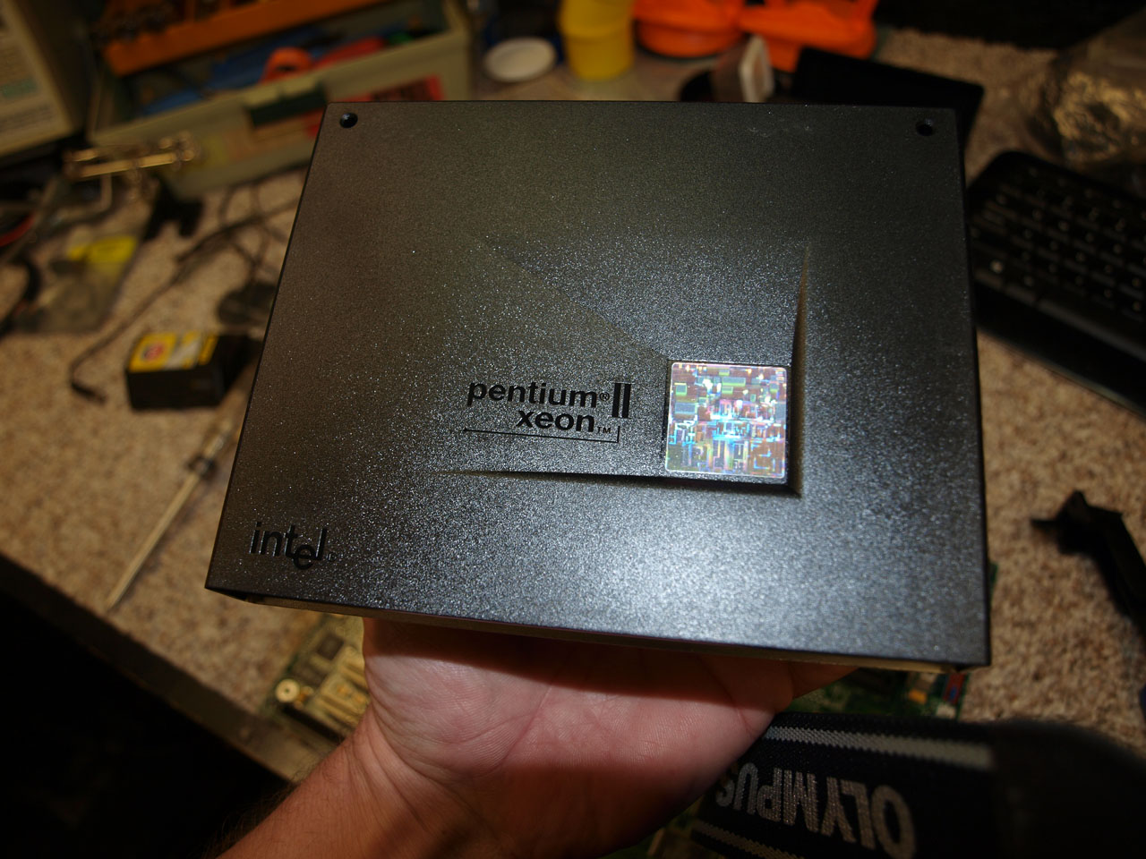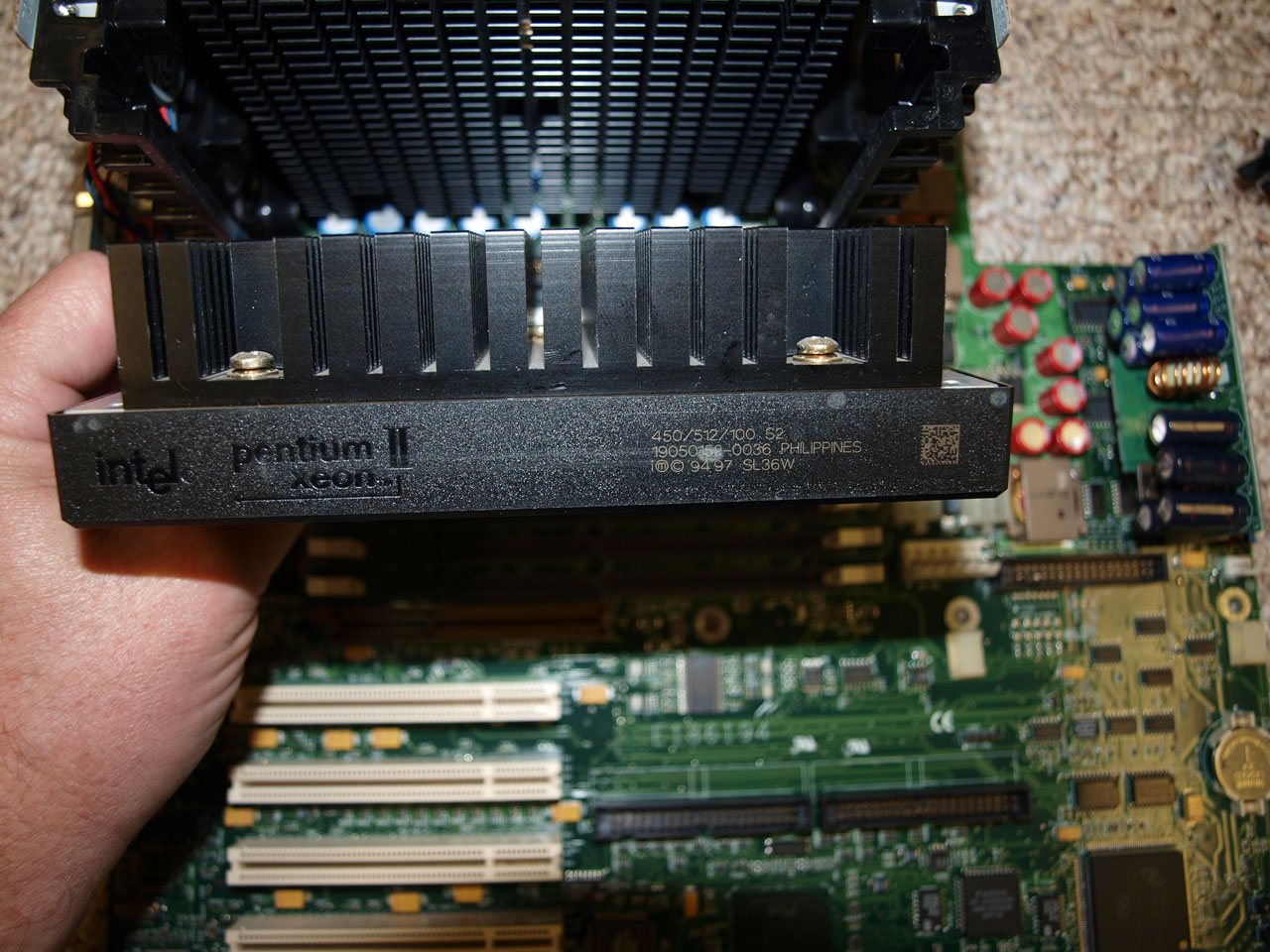 The CPU's included are a pair of 'Drake' core Xeons @ 450MHz, the fastest of the core. These are the Pentium2 equivalent of the Deschutes core....but had L2 cache sizes up to 2MB.