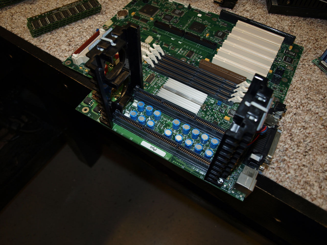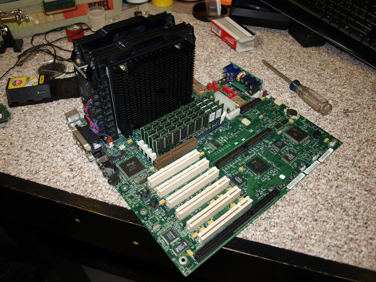 This one is still a work in progress. This would be a nice voodoo3 retro gamer with its AGP; an unusual feature for any slot-2 board....they pretty much all were proprietary server boards with no AGP and onboard video (ick)....but this one was intended as a workstation in its day with the AGP and onboard audio.....more to come.