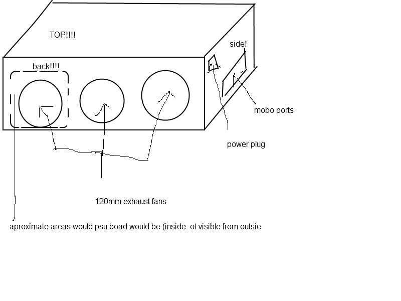 also: i am planning to remoe te metal casing of the psu and just mount the circuit board piece. so let me draw up a quick doodle but this may be far from what it will be like, since i havent meaaured the mobo r anything yet...