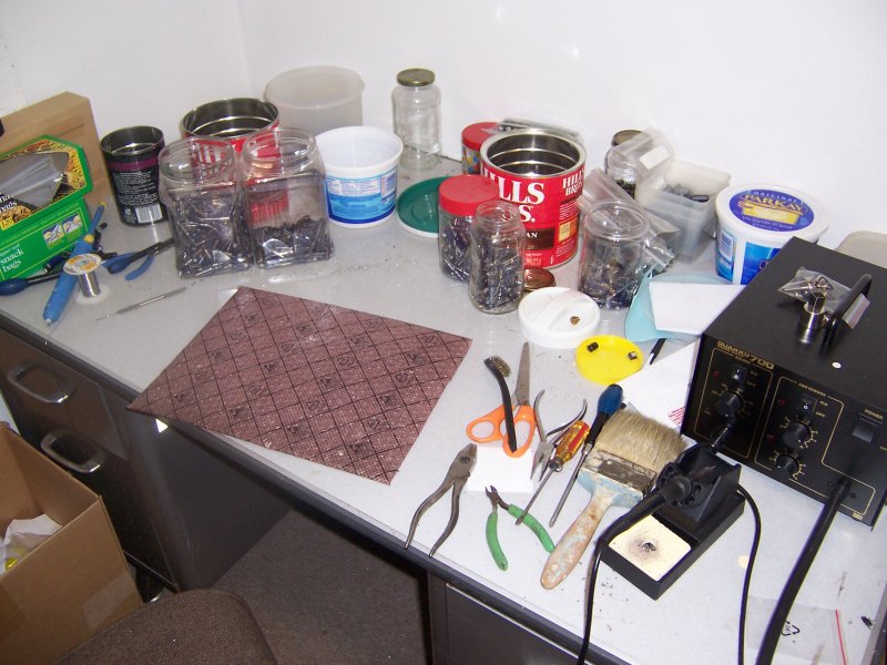 Just thought I'd throw on some new pics of my soldering area. I have a light, iron, and all the caps right at my fingertips. I love these multi-drawer dealies... they make everything more organized and convenient.