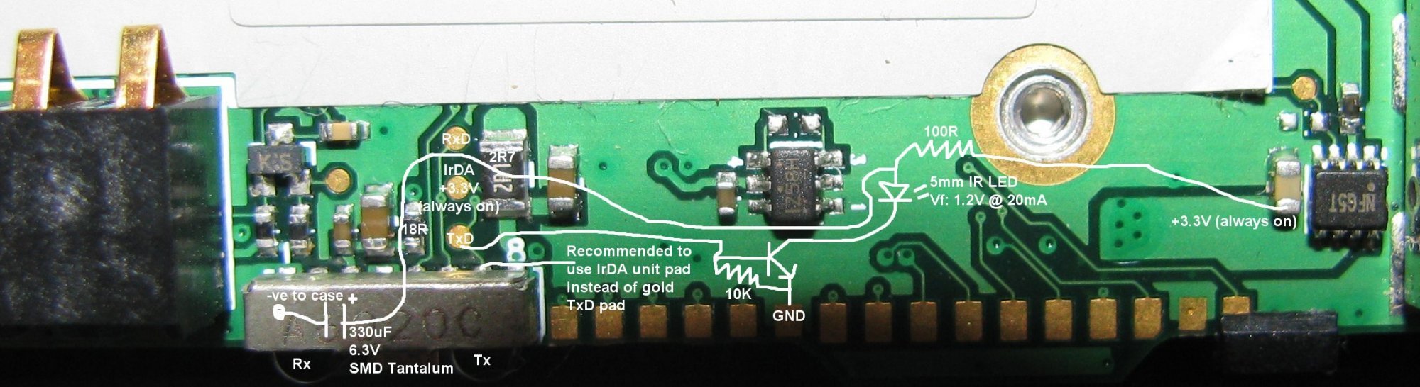 I added a modification for a higher power IR transmitter inside my particular PDA - a project not for beginners, although you can build a simple compact IR repeater and attach the sensor to the transmitting IR LED on the IrDA port (use a camera with a screen and transmit IrDA data to find the transmitting IR LED).