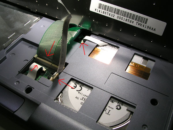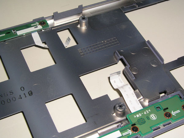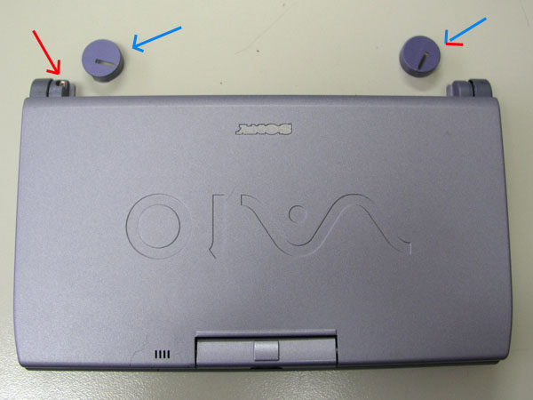 First remove the battery and power from the machine. Then you must remove these purple caps from the hinges. It is quite an annoying job to get them off. I used a small screwdriver. Be careful not to break them.
