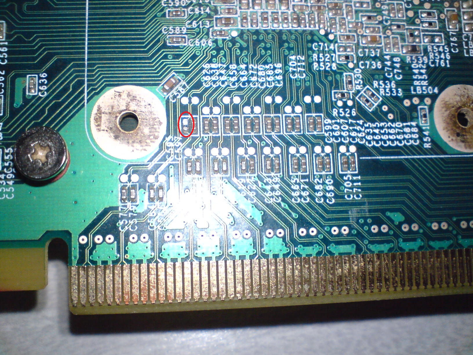 I have a customer with a 7300GT PCI-e card. I found one smd capacitor (very small one) missing. The cap is on the back side connecting one of the pins of the card with the core. The cap is connecting the trace so it's not put there just to filter ripple but also provide continuity. I haven't checked the card yet but the customer said the system would lag and lock up randomly so I guess this is the cause of the problems. I just need your confirmation on the defect. I don't know if my soldering skills are up to the task but I will give it a go so any advice on how to go about this is appreciated. Also would like to ask if going for a cap with the same size from another board would work. I have some closeups but they are kinda blurry.