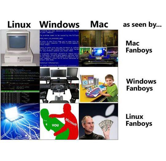 The argument made in the picture you see here is a little problematic. Cause, you can put windows vs linux, as software vs software. But mac has something else going against it...to put in in better perspective, the picture is like (hardware + software) vs software vs software. You can put windows on...many different pieces of hardware out there. Some of that hardware is absolute shit, windows has crashing problem, maybe the hardware is to blame, so you must account for the unidentified hardware in this instance, saying that windows crashes just because windows 'sucks' is like saying i'm an asshole driver because my car stalls in the middle of the road. I can't help it, its not my fault x suddenly broke. In a way, this is somewhat of an advantage mac actually has, is they choose hardware, and quality of the hardware their software is going on. Of course you're going to get better stability (heh usually) from a company that makes the hardware AND the software. But because this company in question has a stick up its ass about allowing other companies to make compatible hardware for it, they actually do more harm to their rep because of this.. Cause, how does microsoft make most of its money? from average joe? NO. From BUSINESSES. Why? Businesses want hardware they can find cheap, well built, and can be maintained with the LEAST amount of effort and time (time IS money) possible. This is where mac fails, and why windows-based computing is the majority of computing world.