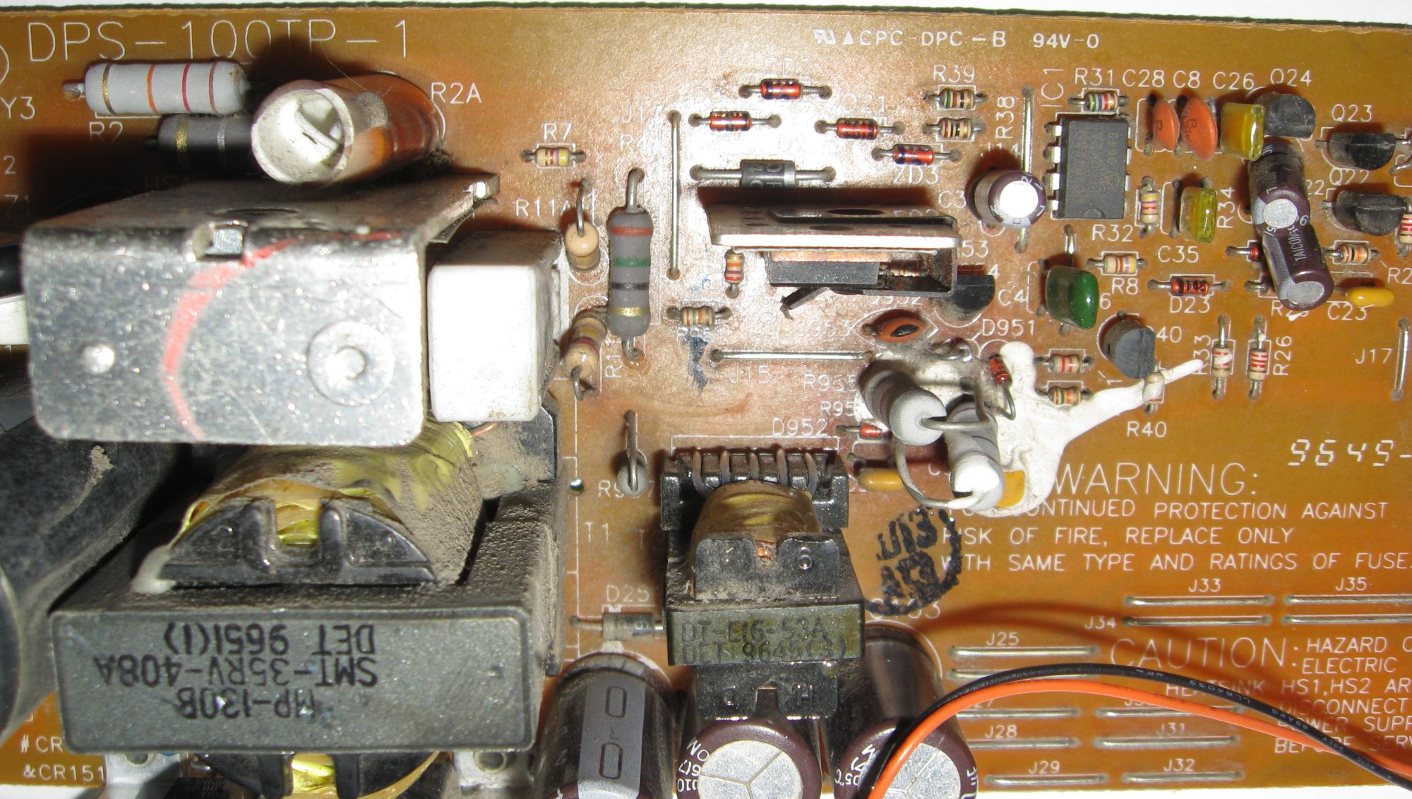Can't determine the main switcher chip due to heatsink, but there's a 1-3w resistor in shrinkwrap almost glued to it that looks to be a bit burned. On the right of the transformer there's another to220 chip that I can't tell what it is due to the heatsink clip.