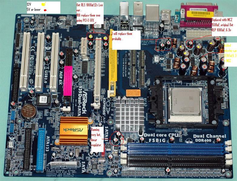 Near the memory banks, there are an linear regualtion circuit, wich will generat some heat. Those 3 caps are getting all very hot, may be Asrock decided for that reason to use 3 of those Ost caps. In any way, if i will get into any trouble with that board, i will replace them very soon with some oscon or some long life caps. On the 939M SIS board from Asrock, i heave seen one single MCZ cap, wich was placed exatlcy where on the DS those 3 Ost caps are. And it is getting very hot too.