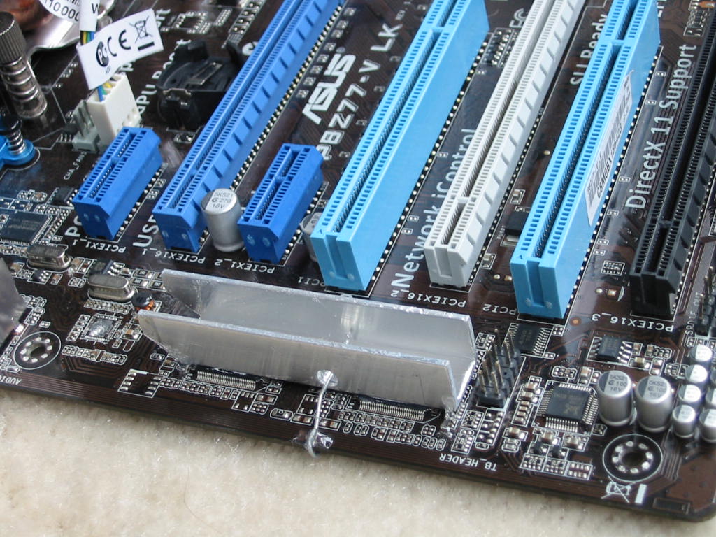 However, the LPC Super IO chip was still scorching-hot. Also, I was not able to make the computer turn OFF at all, so looks like the Super IO and/or southbrdige had taken some damage. But other than that, the PC appeared to POST and I could even boot into Windows. Nonetheless, I felt uneasy regarding the hot Super IO chop, so I decided to make a custom heatsink for it. And the result: