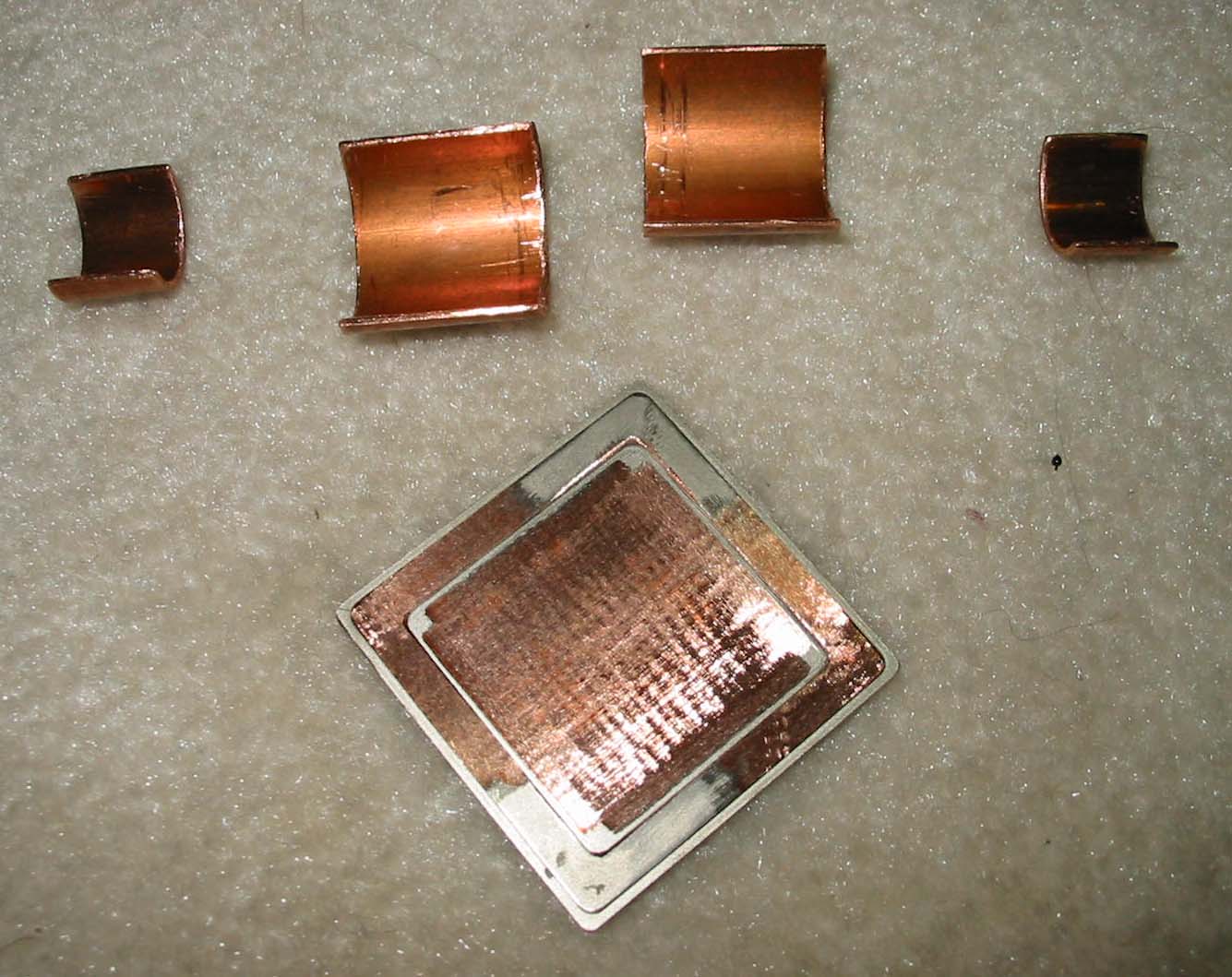 The base is composed of a PS3 CPU copper heatspreader while the fins are pieces of 1/2" and 3/4" (IIRC) plumbing copper pipes cut in half. This is actually what it looked like before I assembled it: