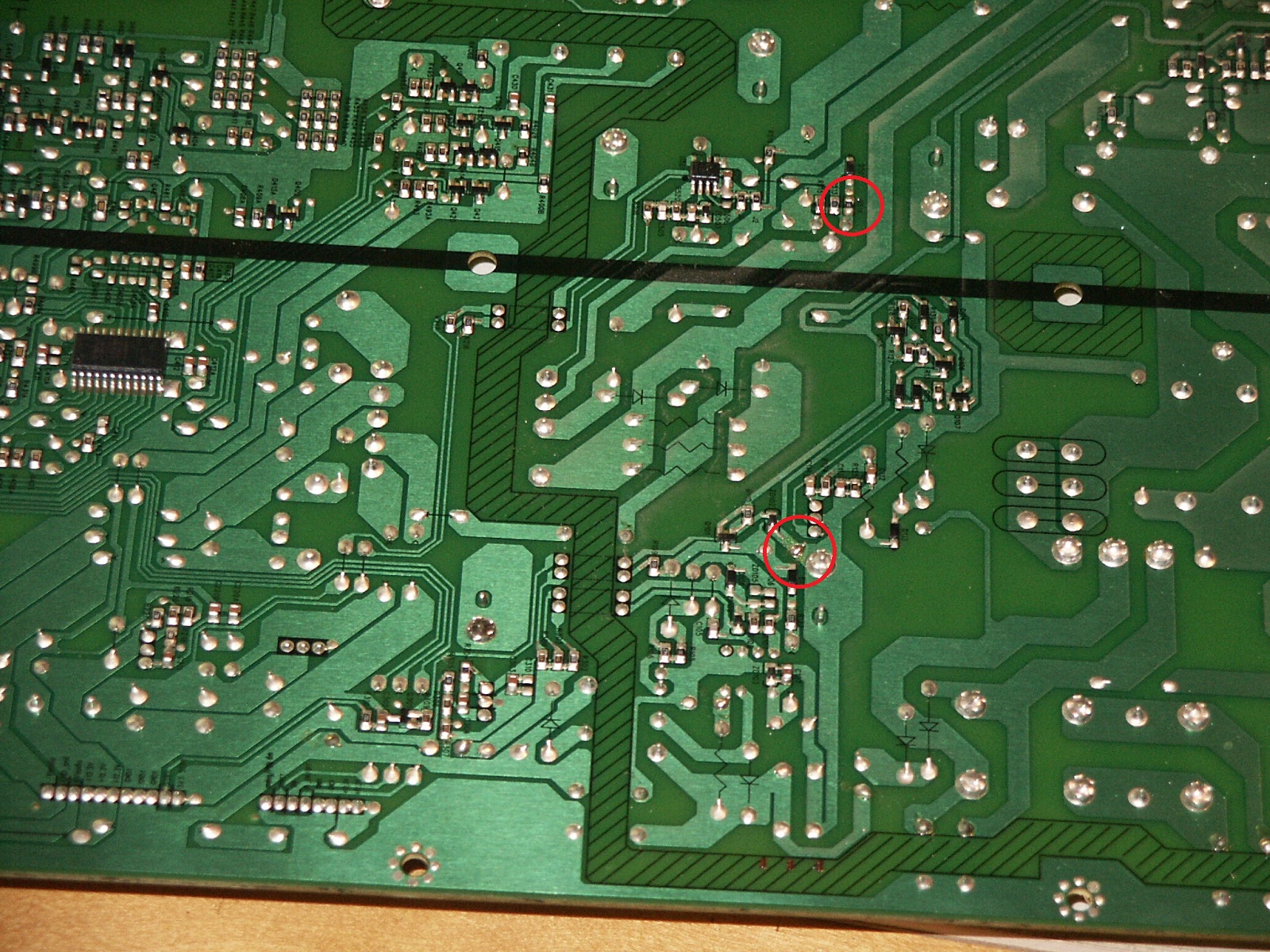 I think I found a slightly swollen cap and what appear to be burnt(?) spots on the power supply board.