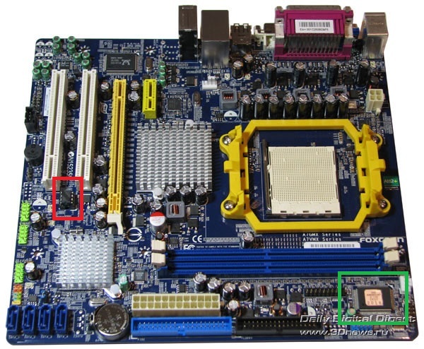 So I got this board from my cousin, its a Foxconn A7VMX AM2/AM2+ mobo. Checking the pics from the manufacturer's website it shows the chip in the socket and the mobo I got is without that chip and the socket is empty. Normally I would test the mobo to see but I'm having a hard time finding a AM2 CPU to test it. Does anyone know what this chip is and will the mobo work without it? I'm hoping it's for some non critical features. Here are some pics from the net showing where the chip is located.