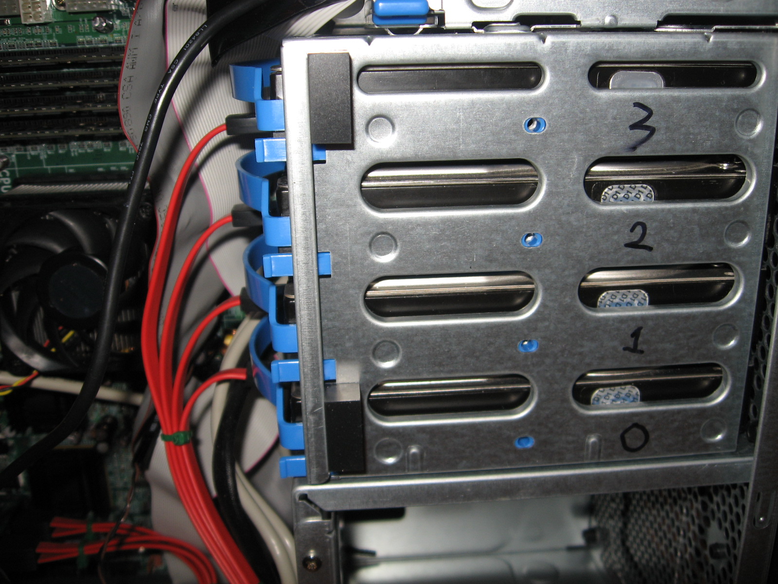 Note the newly installed SMD header on the 3ware card, and the custom LED header extension connected to it.