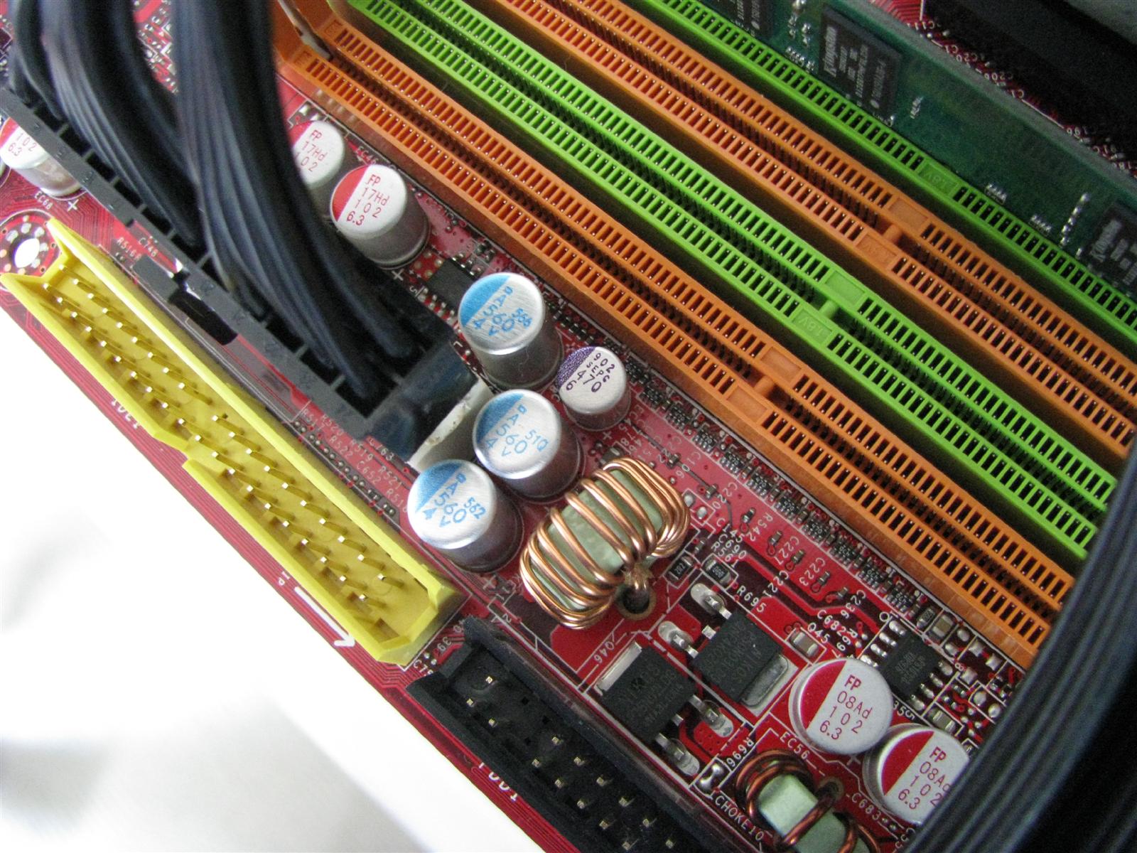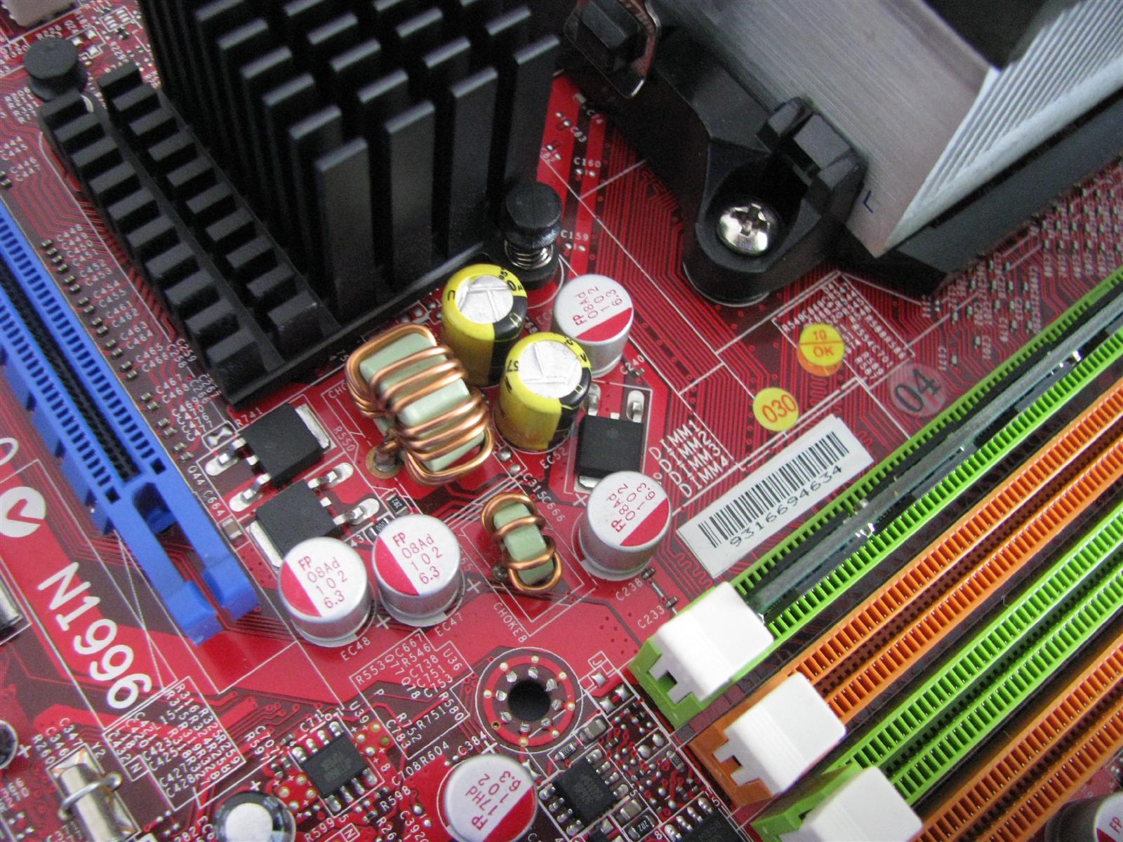 560uF 4V NCC PSA on the RAM VRM (note that there were only 2 1800uF caps there originally, with a blank spot for a 3rd one. I filled the blank spot up)