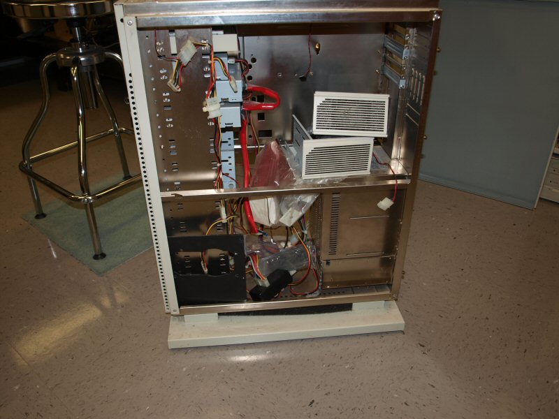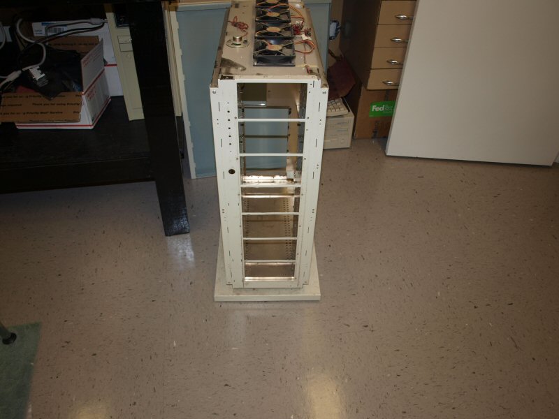 Anyway, I figured what the hell....why not put her back together....for old time sake if for no other reason. The HDD's were all SCSI, and are long gone. I sold those many years ago, while they were still worth somethign...so I'll have to dig up some replacements, and it seems 68 pin SCSI HDD's are dirt cheap now, even for large sizes! Anyway, first things first with the case... It's been sitting in the garage since retirement in 2010 with junk stacked on it. It weighs about 70lbs, I wasn't toting it up to the attic. It stands 33" tall. it is FILTHY!!