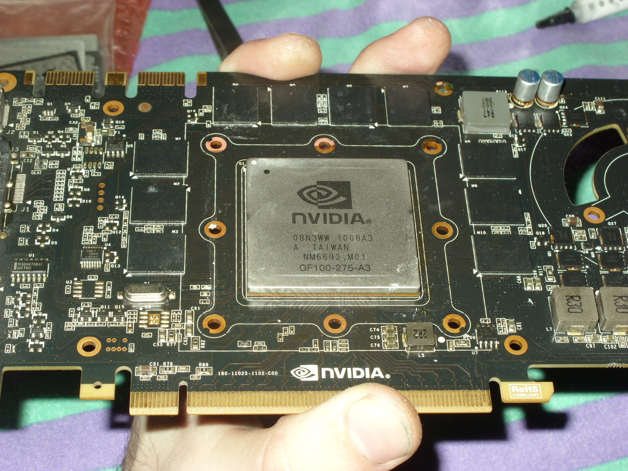 I expected something along the lines of a 8800gtx, but instead, what he brings in is this... I immediately said that even LOOKING at that is going to cost $$. I started taking it apart as soon as he brought it in, exposing a huge motha' BGA with an IHS on it. Well, that's a big one... I'm well used to reballing and replacing laptop BGAs, but this is ONE BIG CHIP. I took only the card itself home and left the cooler and all the screws at work (i no longer have a desktop PC so i don't have a way to test it at home) and said i'll give it a shot. Told the guy we'll ring him to bring his PC in so we can test the card once it's done.