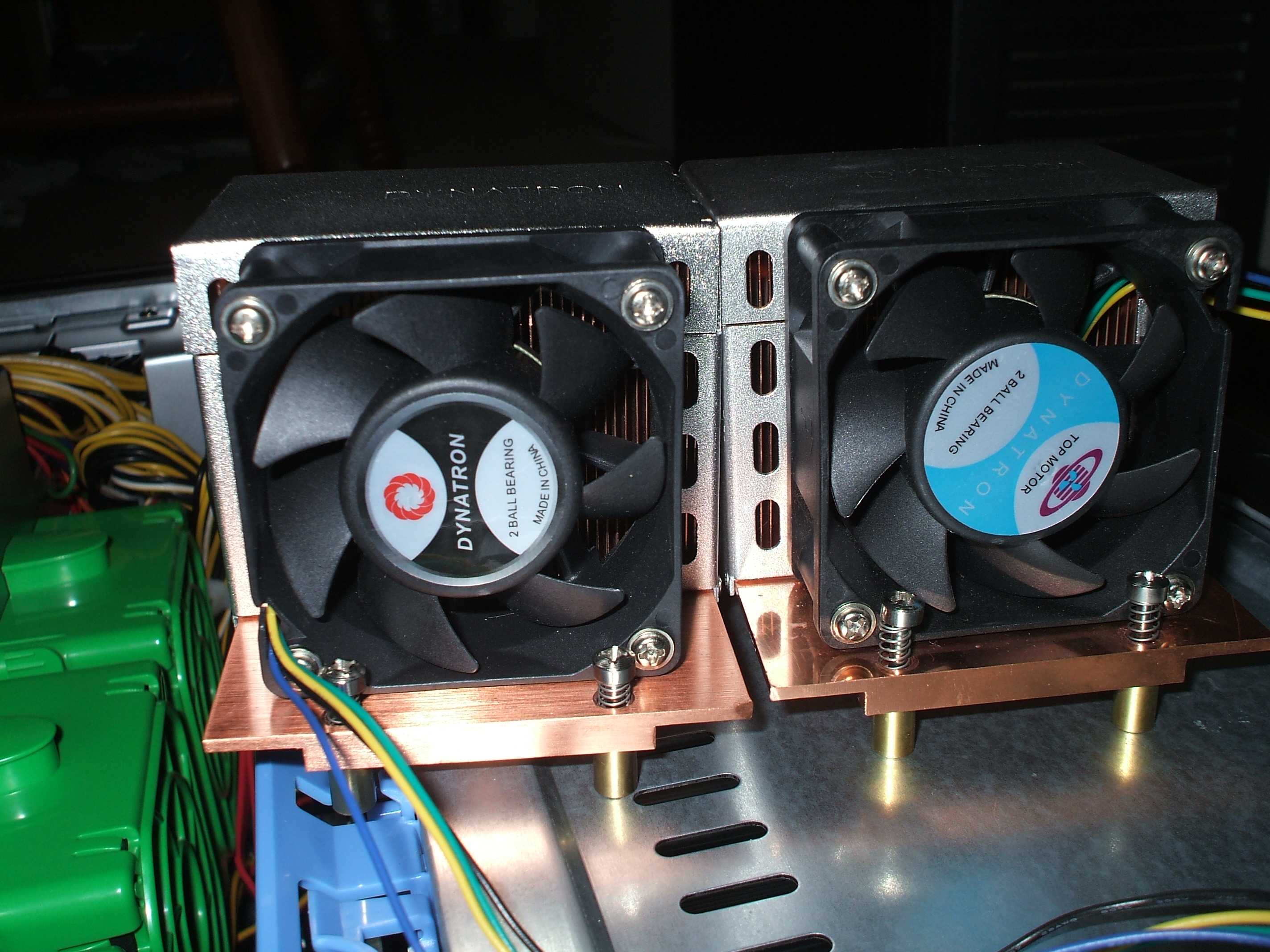 I've settled on the Dynatron H6DG as that's the only 2U cooler that's also a side blower that isn't going to cost $50 a cooler.
