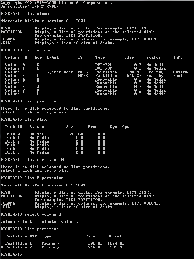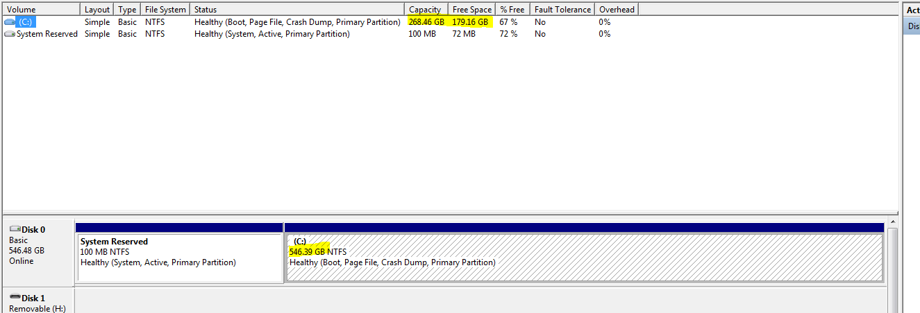 ). After running some command line stuff off a windows 7 disc (to restore the bootloader) I have a bootable 7-only system... but it seems my expanded partition didn't fully update:Shows correctly in diskpart: