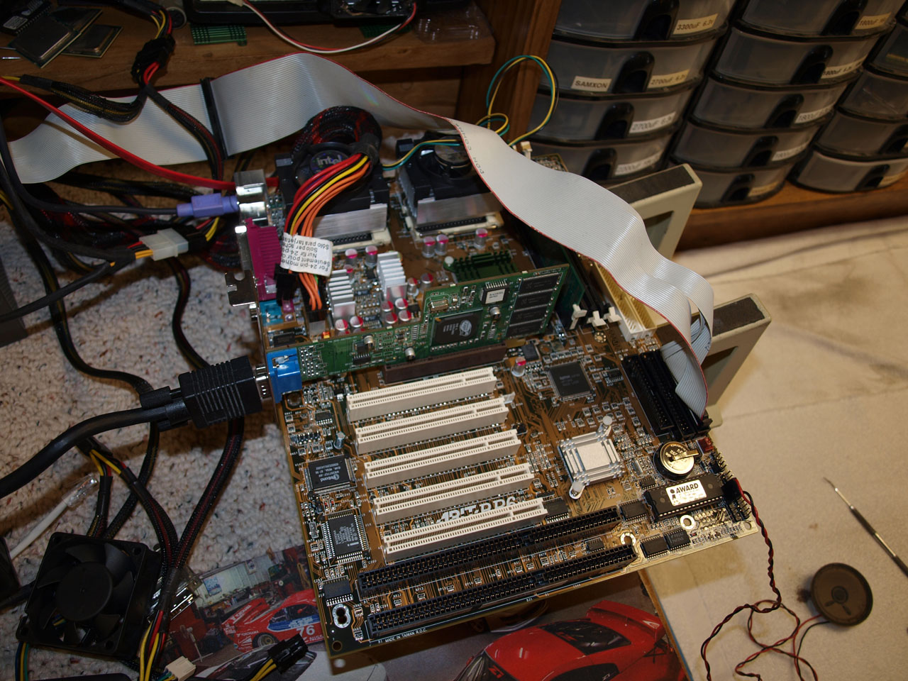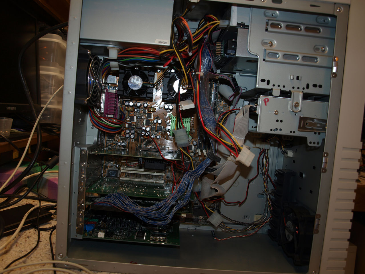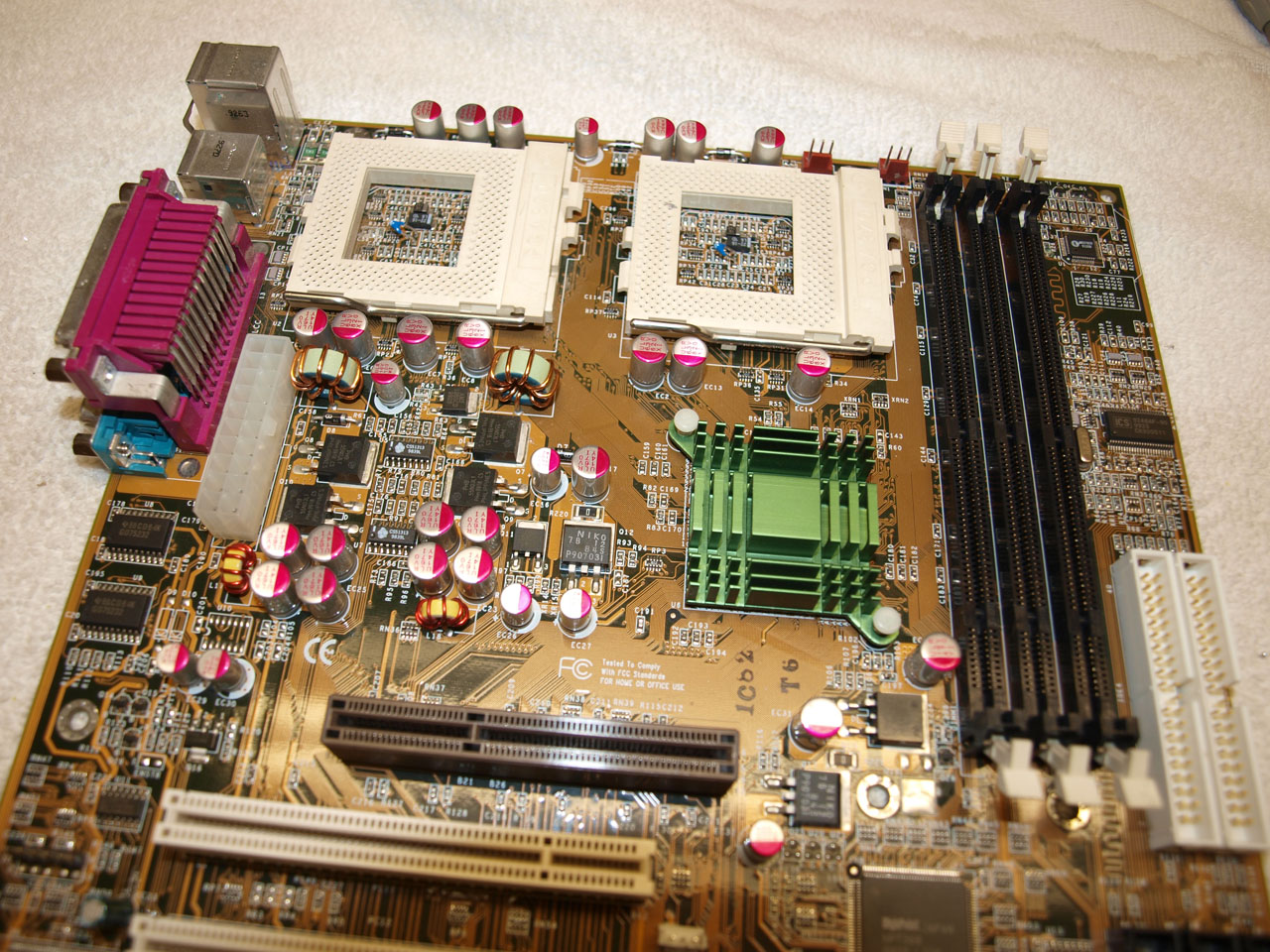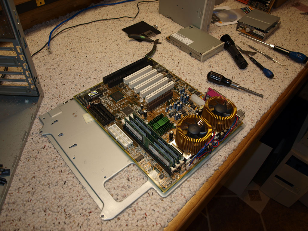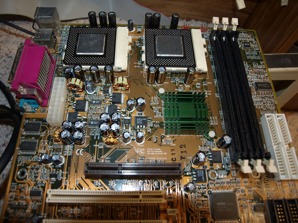 I've begun the ground work for yet another classic retrobox, the legendary Abit BP6! I bought this off ebay, seller claiming there was a pair of 300A's in it....well, they turned out to be 366's... I didn't discover this until I completely recapped the board, so sending it back for a refund is out... I'll either get a partial refund and leave positive feedback, or get nothing back, and he'll get a ripe one... I do happen to have a pair of 300A's from another deal though, so the project moves forward, but leaves another build in the lurch... I didn't pay much for this, so I'm not going to get too excited....but I really wanted the second set of 300A's, as they're very hard to find in a PPGA370 package, most were slot-1. It came with 768mb RAM (most supported by the board) a pair of Thermaltake 'golden orb' coolers, a NIC, and a SB Live sound card.